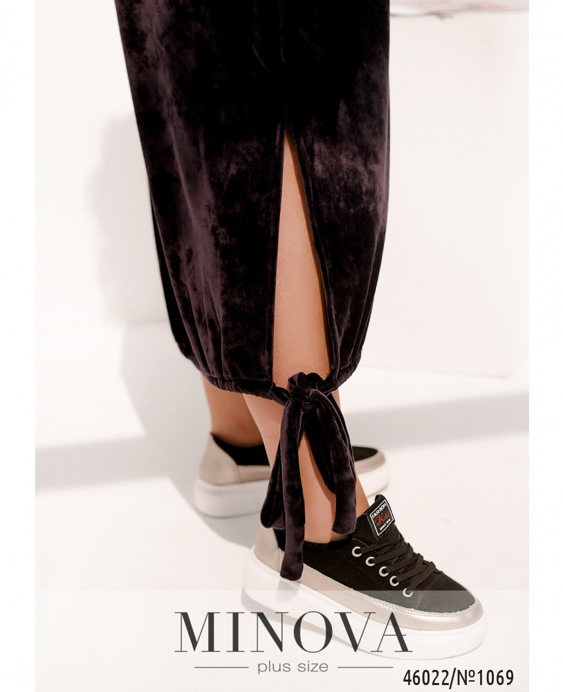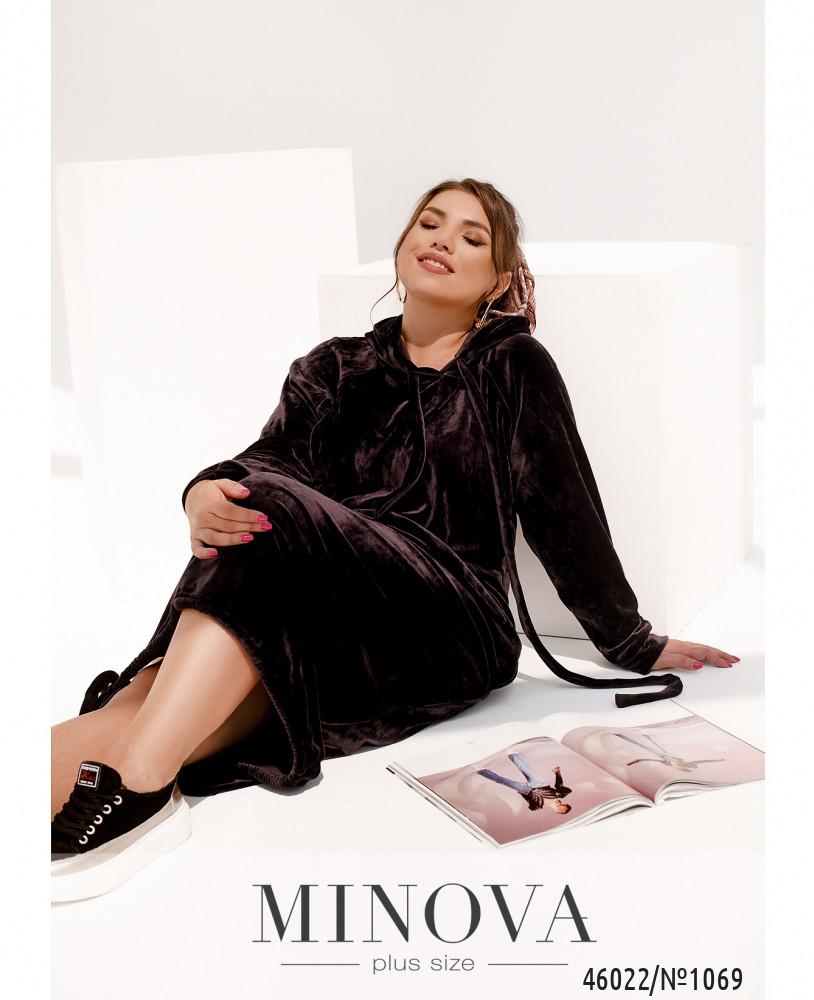 Мягкое платье батал без застёжек, по бокам - врезные карманы, в наличии капюшон с пропущенным через него шнурком. Рукава с мягкими манжетами без пуговиц. Через подол снизу пропущен шнурок, который завязывается сбоку, затягивая длинный разрез.