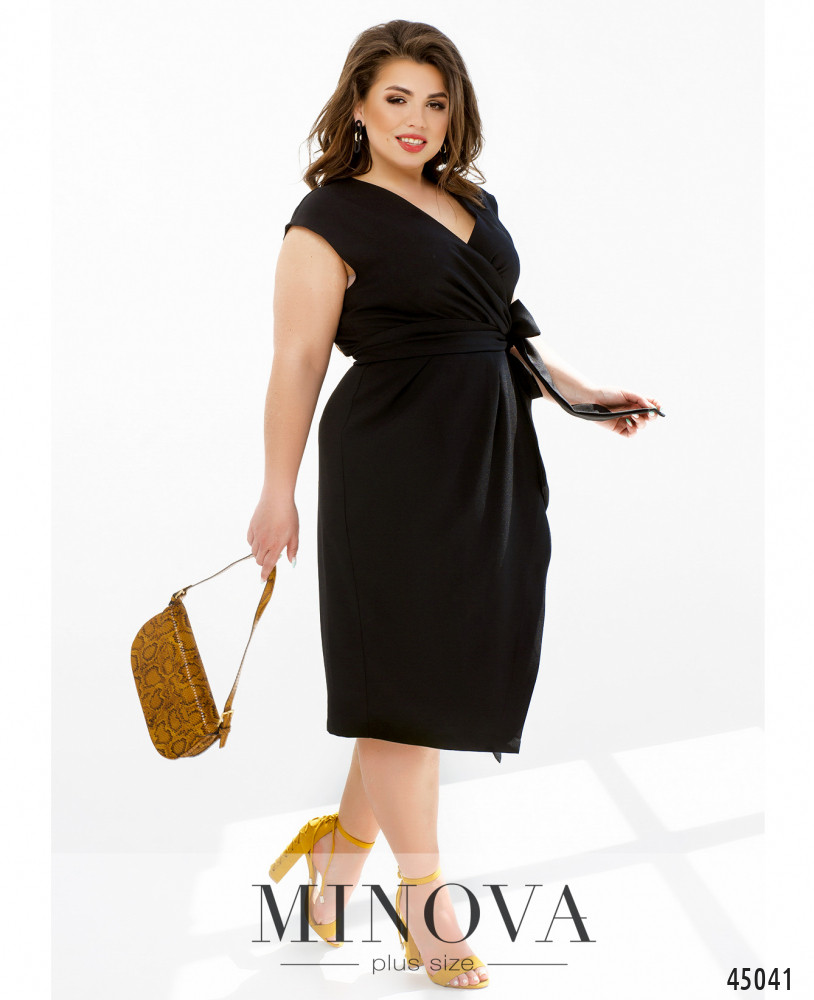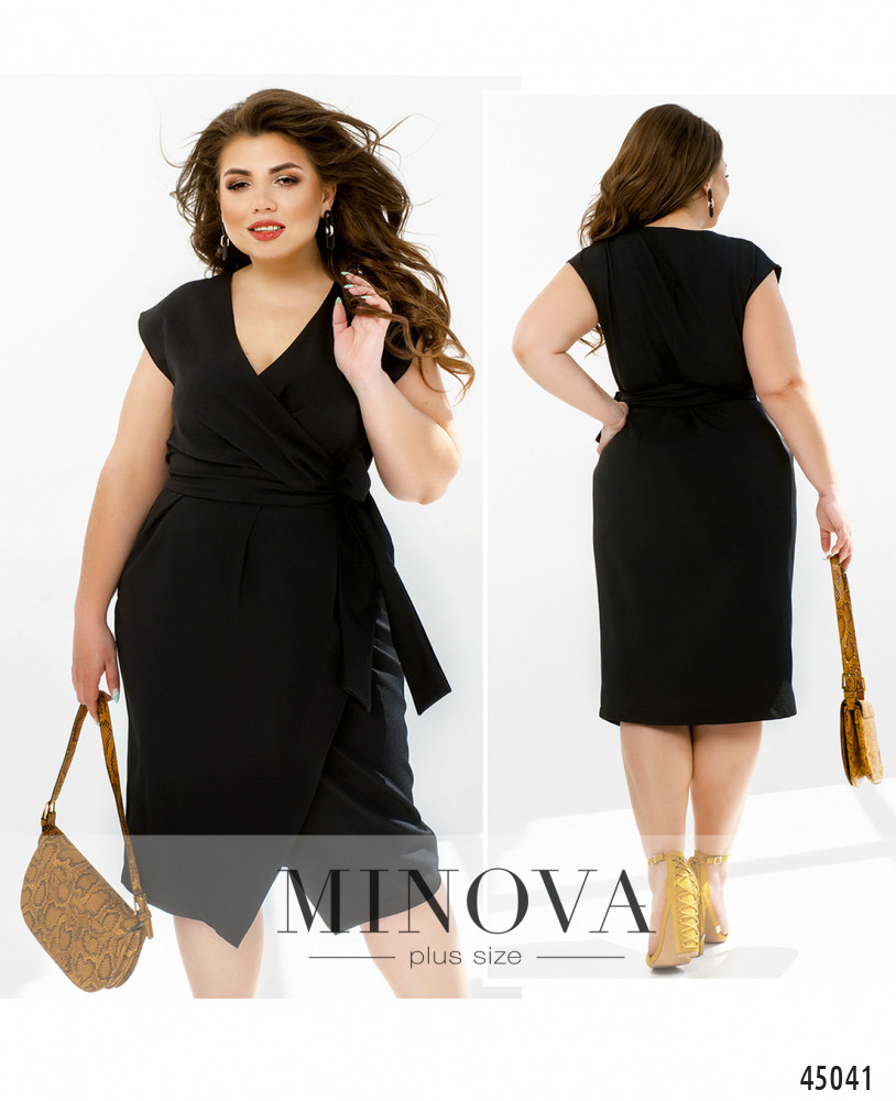 Стильное платье батал на запАх, застёгивается на молнию сзади на спинке и завязывается с помощью ленты, которая продевается на талии. Без рукавов и карманов.
