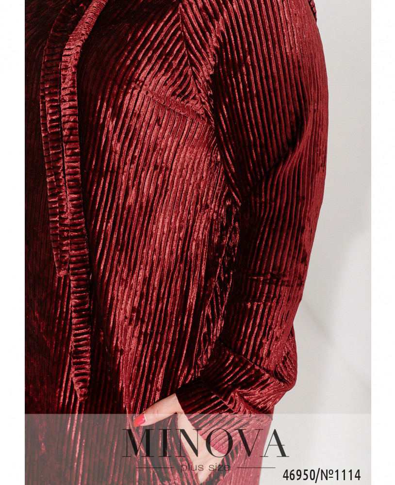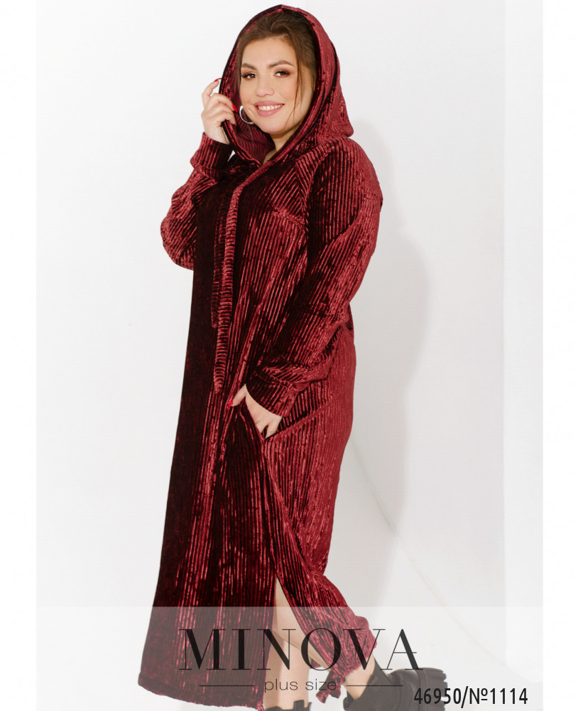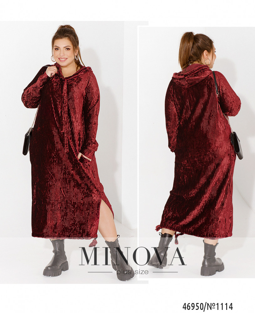 Мягкое платье батал без застёжек, по бокам - врезные карманы, в наличии капюшон с пропущенным через него шнурком. Рукава с мягкими манжетами без пуговиц. Через подол снизу пропущен шнурок, который завязывается сбоку, затягивая длинный разрез.