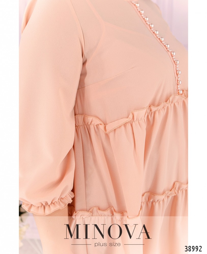Элегантное платье батал А-силуэта с тремя рядами оборок, украшенное жемчужинами от полукруглого выреза горловины до талии. В рукавах на запястьях вшиты резинки, на груди вытачки. Застёжек и карманов нет.
