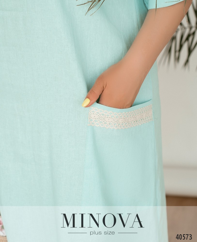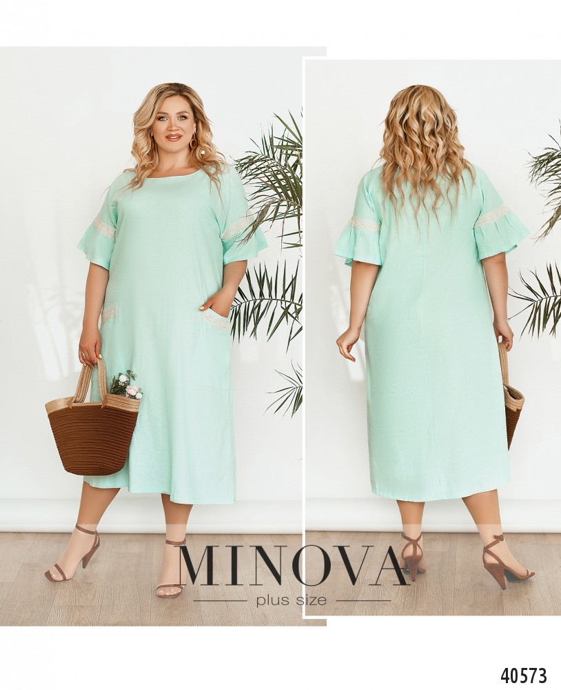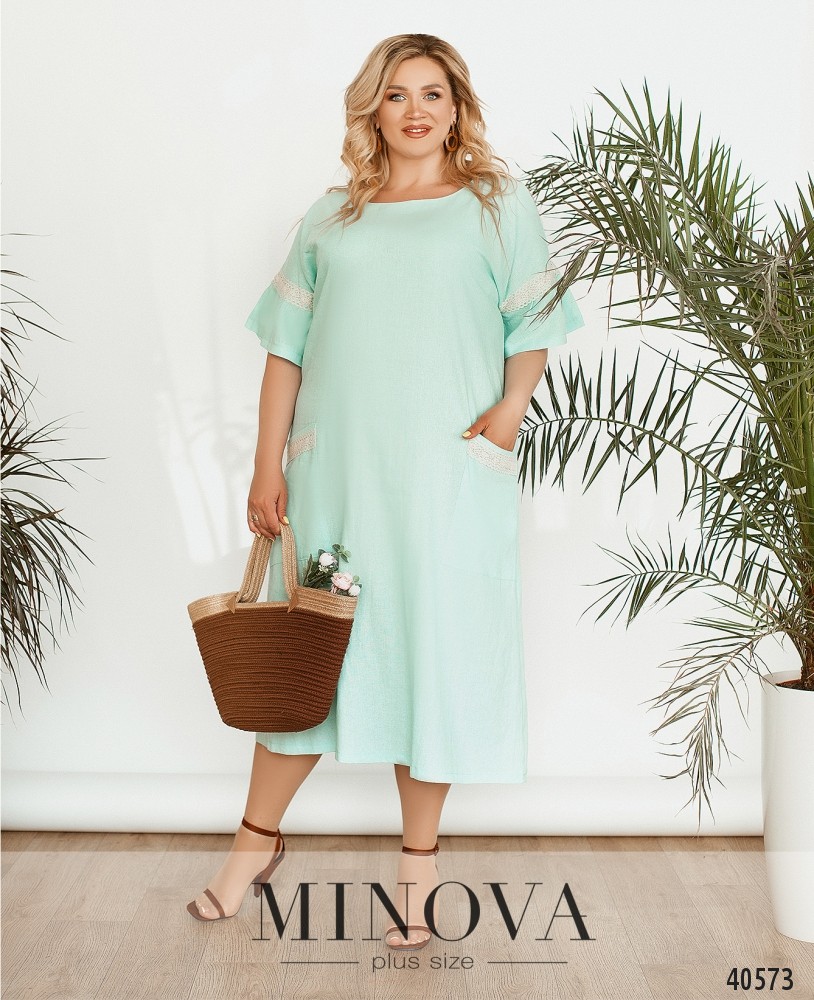 Нежное и женственное платье большого размера, украшенное кружевом на рукавах и на накладных карманах, расположенных по бокам. Вырез горловины "лодочка", застёжек нет. Рукава с небольшими мягкими оборками. Украшение входит в комплект.