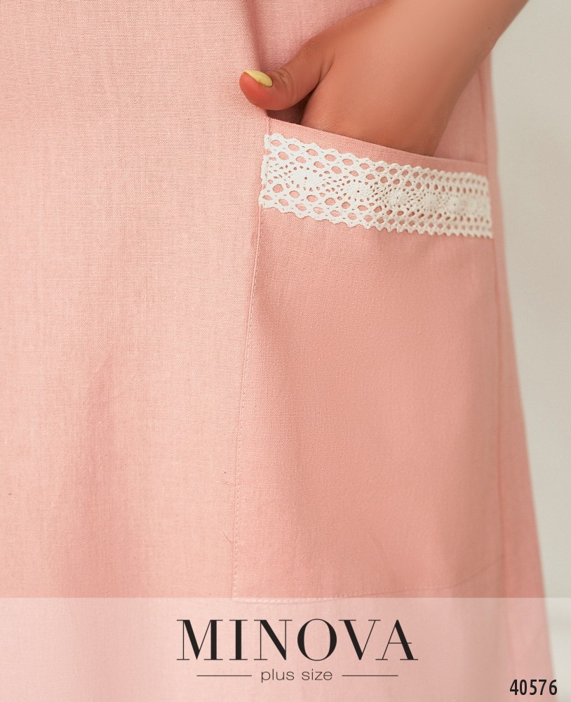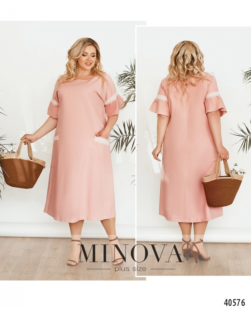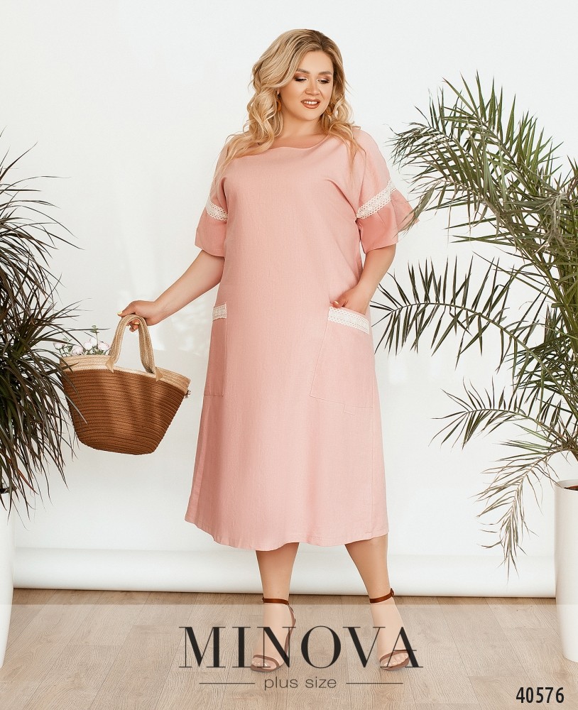 Нежное и женственное платье большого размера, украшенное кружевом на рукавах и на накладных карманах, расположенных по бокам. Вырез горловины "лодочка", застёжек нет. Рукава с небольшими мягкими оборками. Украшение входит в комплект.