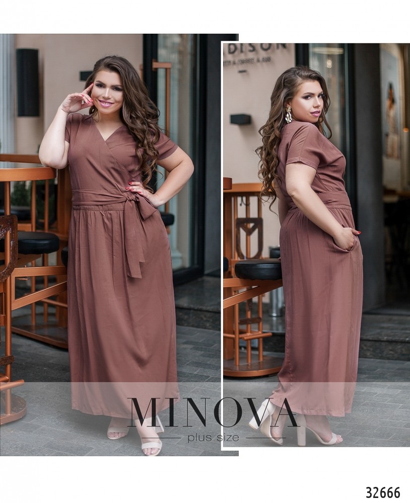 Классическое платье А-силуэта будет уместно при любых модных веяниях. Особенно, если оно ярко-красное или глубокого синего цвета. А для модниц – свежий оливковый или цвета смородинового варенья. Платье большого размера из каталога Minova – с запАхом, карманами и поясом в комплекте, на талии – вставка ткани под пояс. Застёгивается на скрытую змейку от левой подмышки до талии, рукава – свободные. Материал лёгкий, отлично «дышит», не просвечивает и не растягивается, но и не обтягивает фигуру, поэтому хорошо впишется в гардероб вне зависимости от типа фигуры.