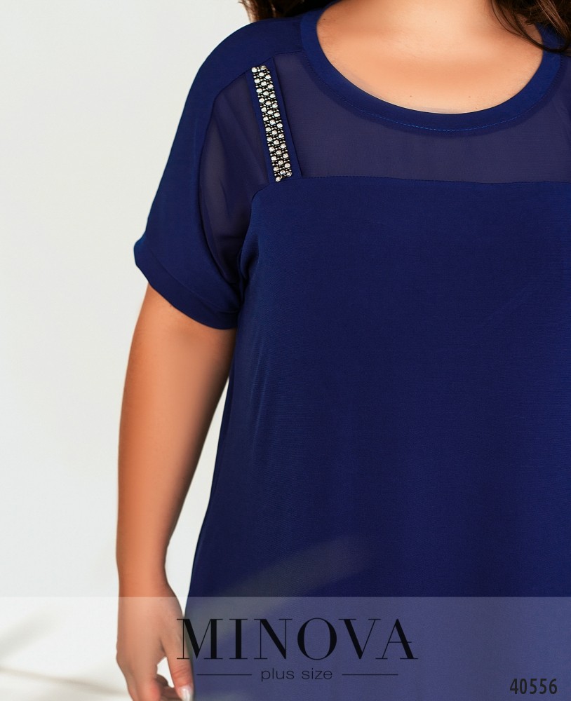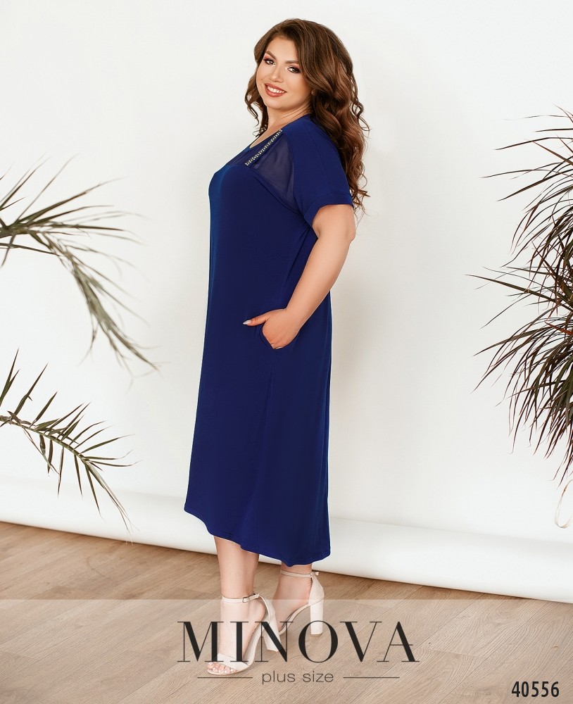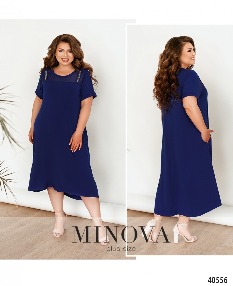 Привлекательное платье большого размера свободного покроя в минималистичном стиле. Без застёжек, по бокам - врезные карманы. Верх платья полупрозрачный, украшен двумя лентами с кабошонами. Подол асимметричный, по спинке чуть длиннее. Вырез горловины полукруглый.