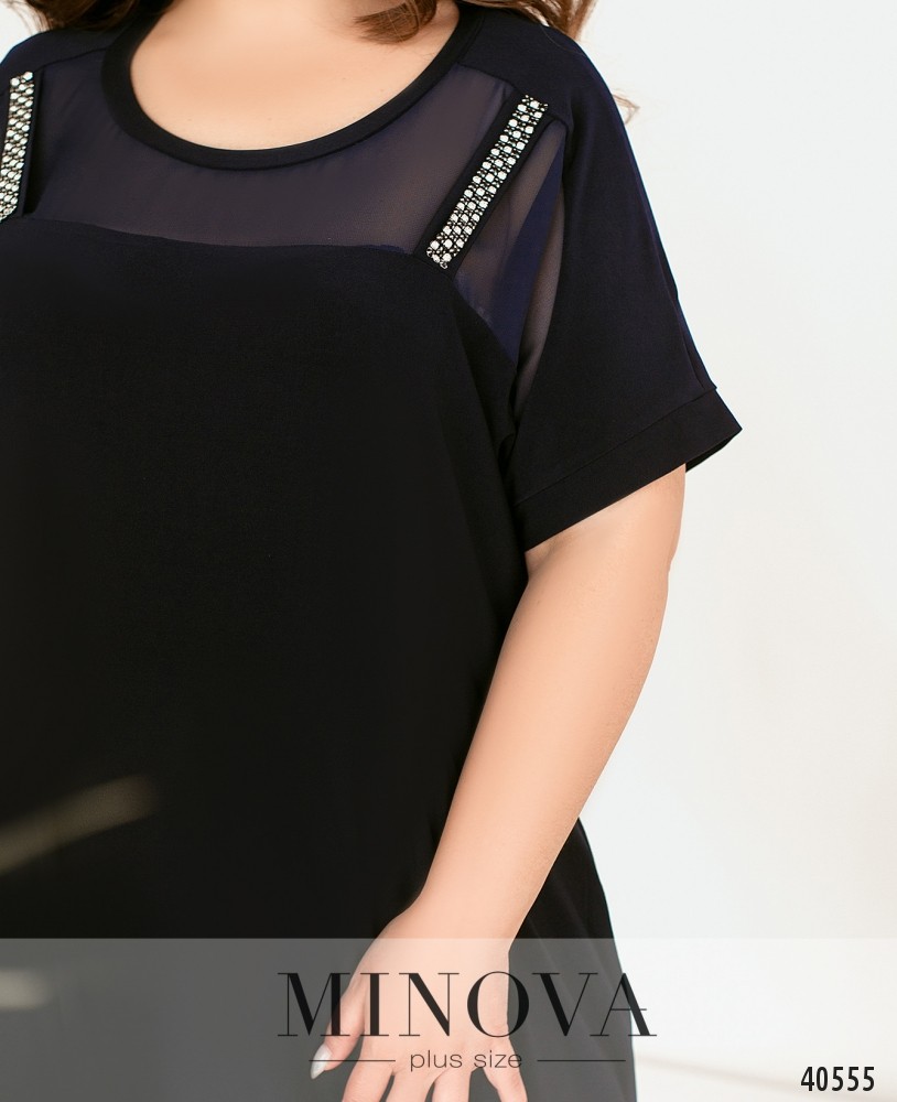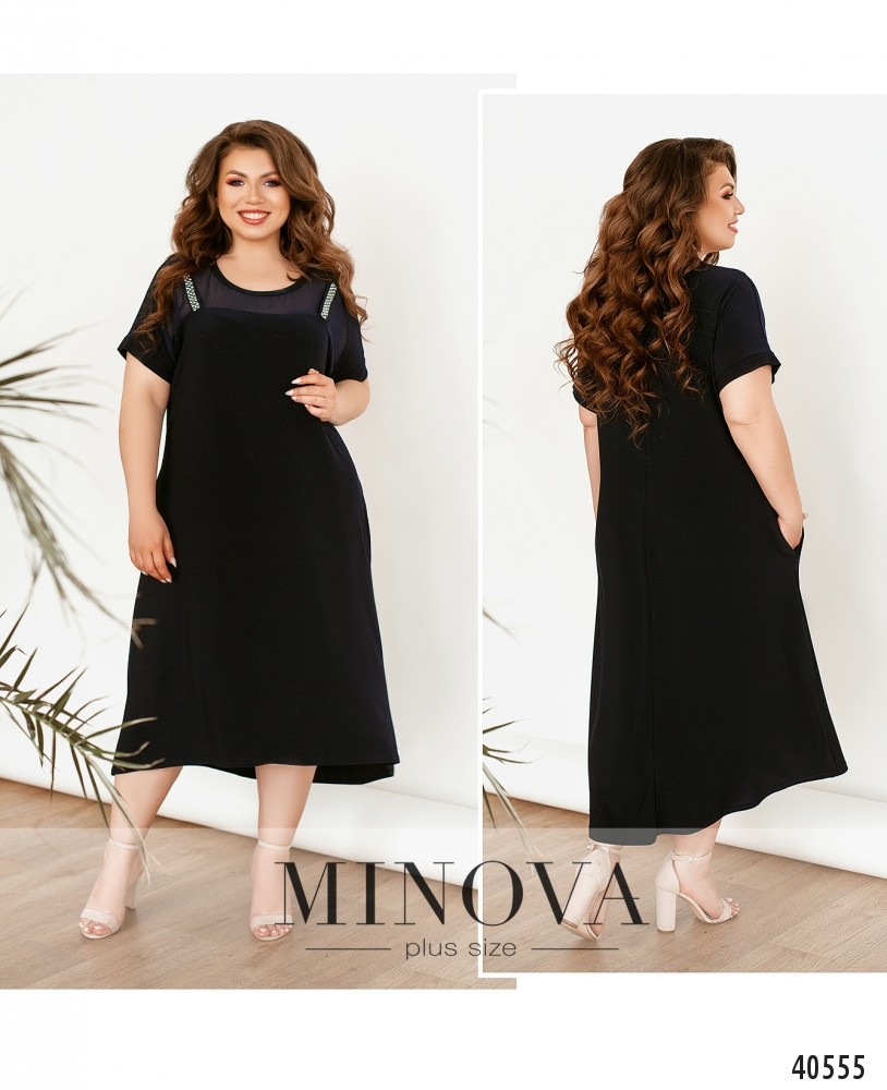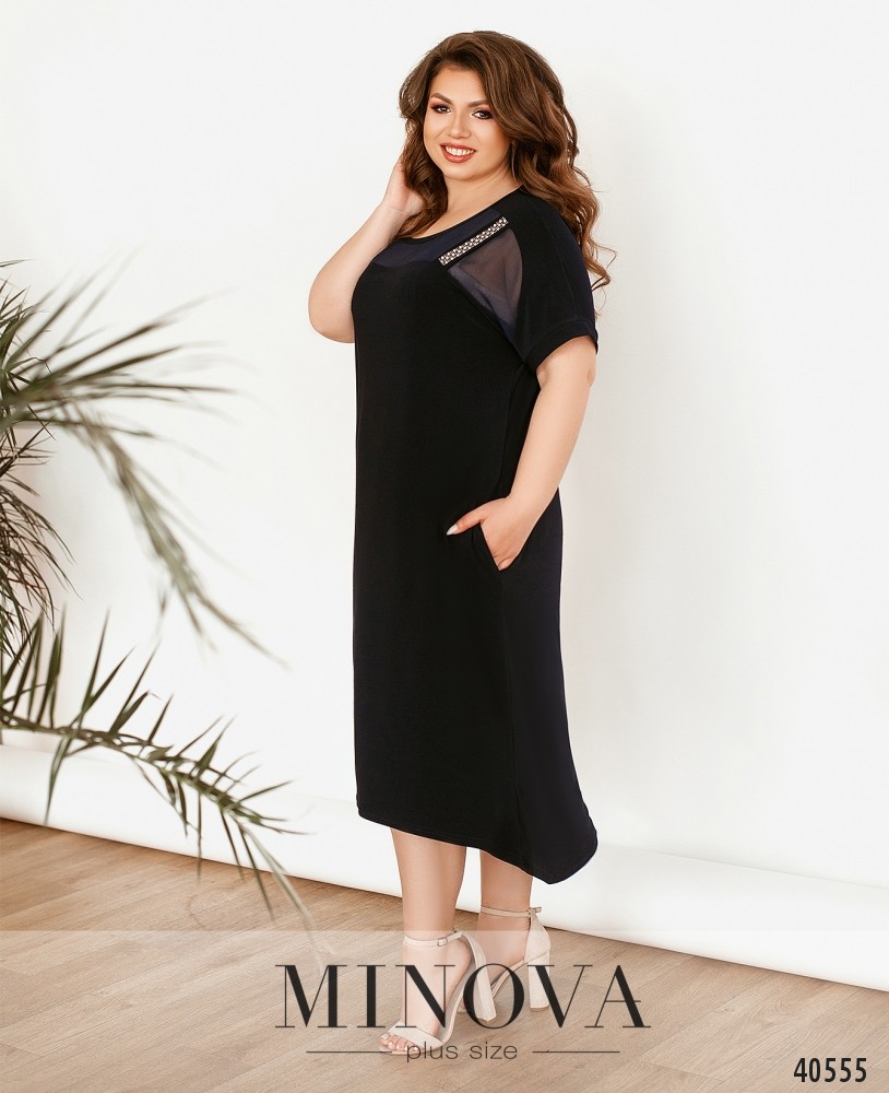 Привлекательное платье большого размера свободного покроя в минималистичном стиле. Без застёжек, по бокам - врезные карманы. Верх платья полупрозрачный, украшен двумя лентами с кабошонами. Подол асимметричный, по спинке чуть длиннее. Вырез горловины полукруглый.