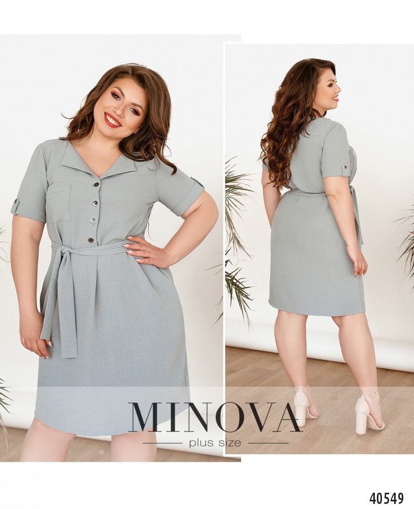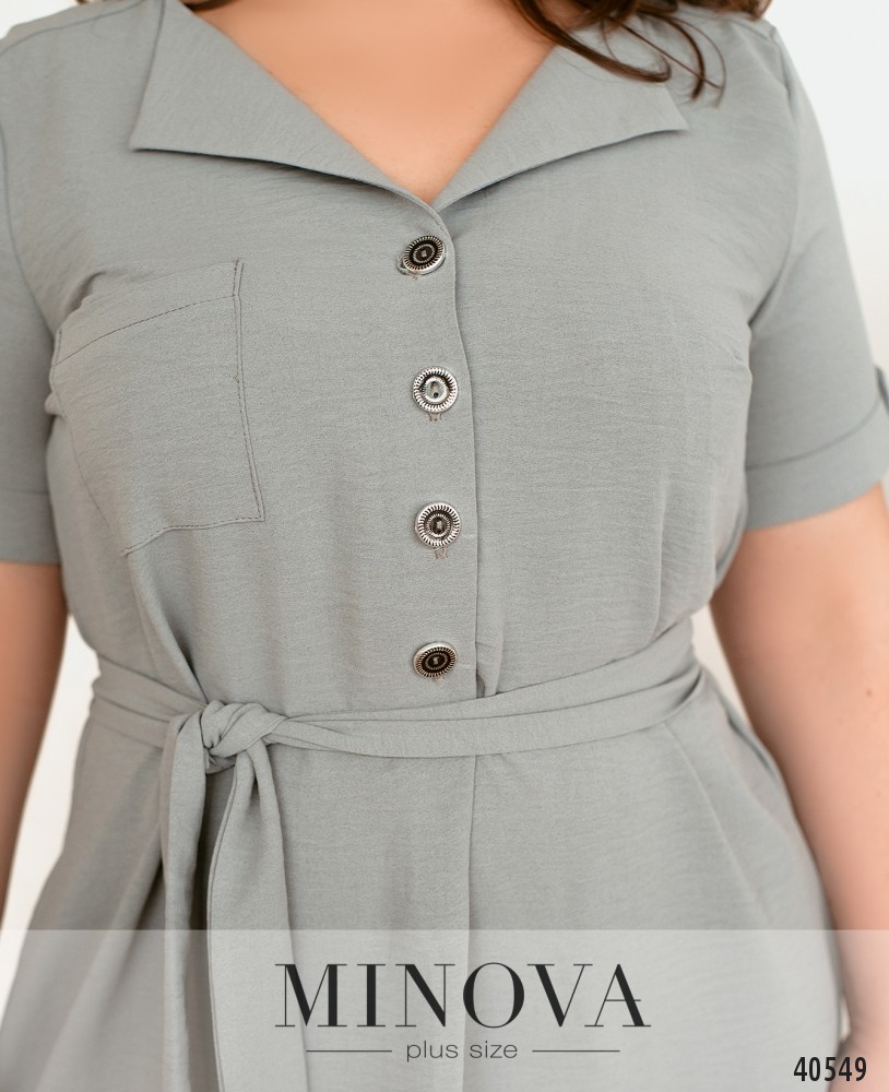 Нежное повседневное платье батал в пастельных тонах. Воротничок небольшой, отложной, под ним - ряд пуговиц на планке. По бокам врезные карманы, на правой стороне груди - небольшой накладной кармашек. Рукава с короткой подшитой регулировочной лентой. В комплекте пояс.
