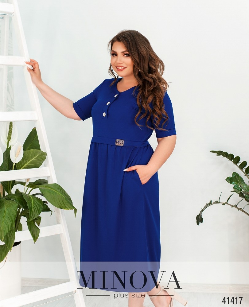 Стильное платье батал со врезными карманами по бокам, пуговицы декоративные, застёжка - вшитая по спинке молния. Рукава с небольшими подворотами, подол подшит к верху, на талии - декоративная нашивка.