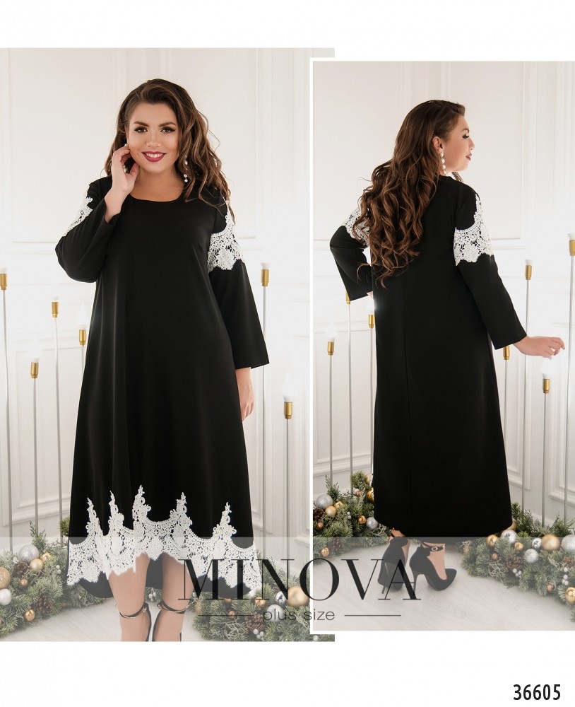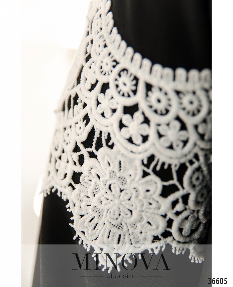 Контрастная вставка изящного кружева украшает это платье батал от Minova на плечах и на подоле спереди. Подол асимметричный, по спинке чуть длиннее. Платье А-силуэта выглядит по-настоящему нарядно и привлекательно, особенно благодаря оригинальным расцветкам. Модель в чёрном цвете с белым кружевом особенно необычна! Но вы можете выбрать и более сдержанные тона. Платье без карманов и застёжек, рукава длиной ¾, без манжет. На груди – диагональные вытачки. Вырез горловины полукруглый, чуть глубже стандарта. В комплекте прилагается нежная подвеска на длинной цепочке.