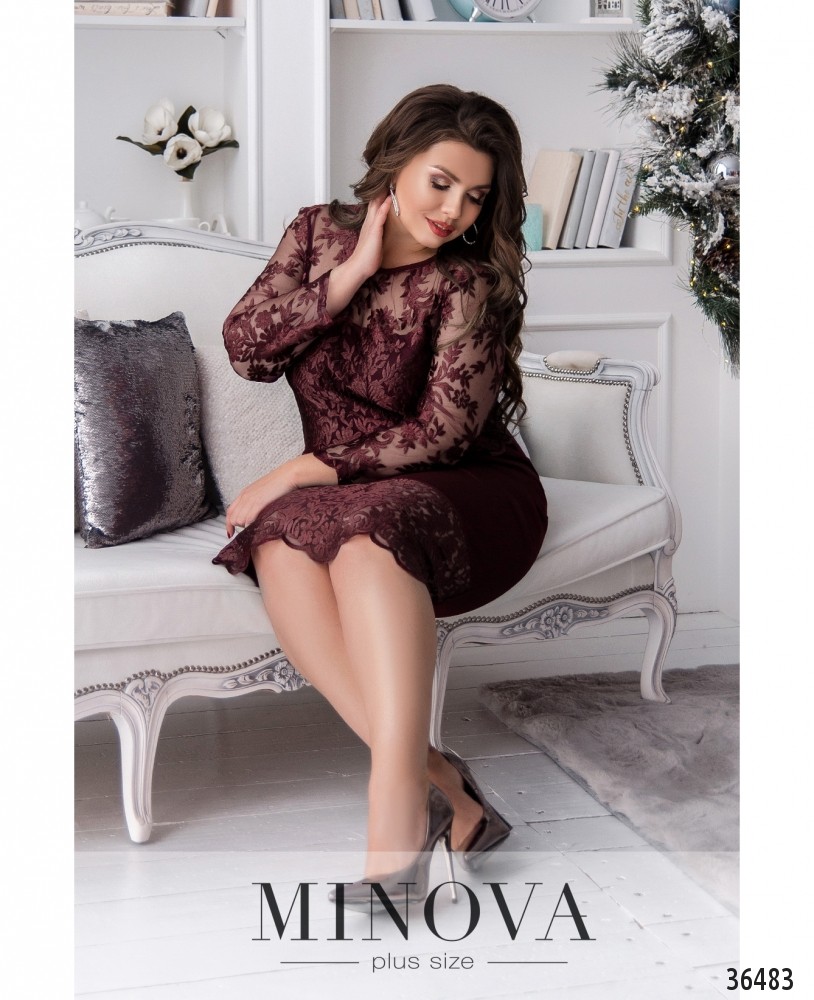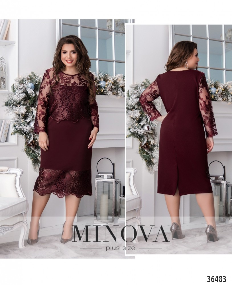 Ажурное блестящее кружево расположено на представленной модели платья батал на подоле спереди и сверху, в виде накидки. Minova предлагает в новом каталоге нарядное платье прямого кроя из мягкой, приятной ткани. Платье без застёжек и карманов, с небольшими вытачками на груди. Рукава полностью из кружева, без подкладок. На лифе кружево с подкладкой, прикрывающей грудь, а плечи - полупрозрачные. Спинка полностью закрыта, снизу сзади – небольшая шлица. Выберите пастельный или глубокий оттенок красного, синего или чёрного, и дополните образ удачно выбранной обувью.