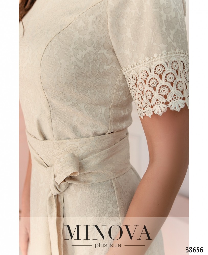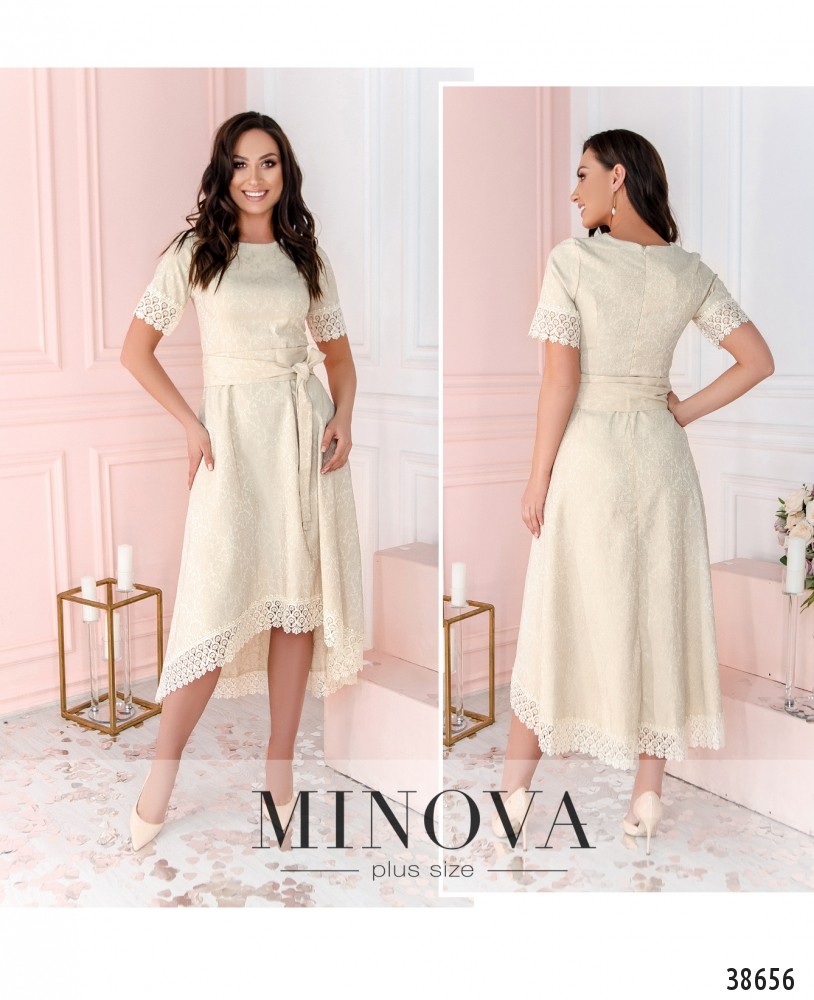 Женственное и очень привлекательное платье батал, украшенное на рукавах и подоле кружевом. Подол асимметричный, по спинке длиннее, вырез горловины полукруглый, подол подшит к верху, в комплекте пояс. Застёгивается на вшитую по спинке молнию, карманов нет.