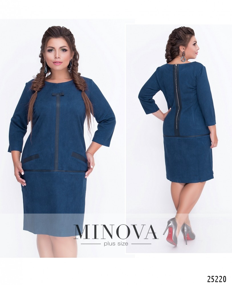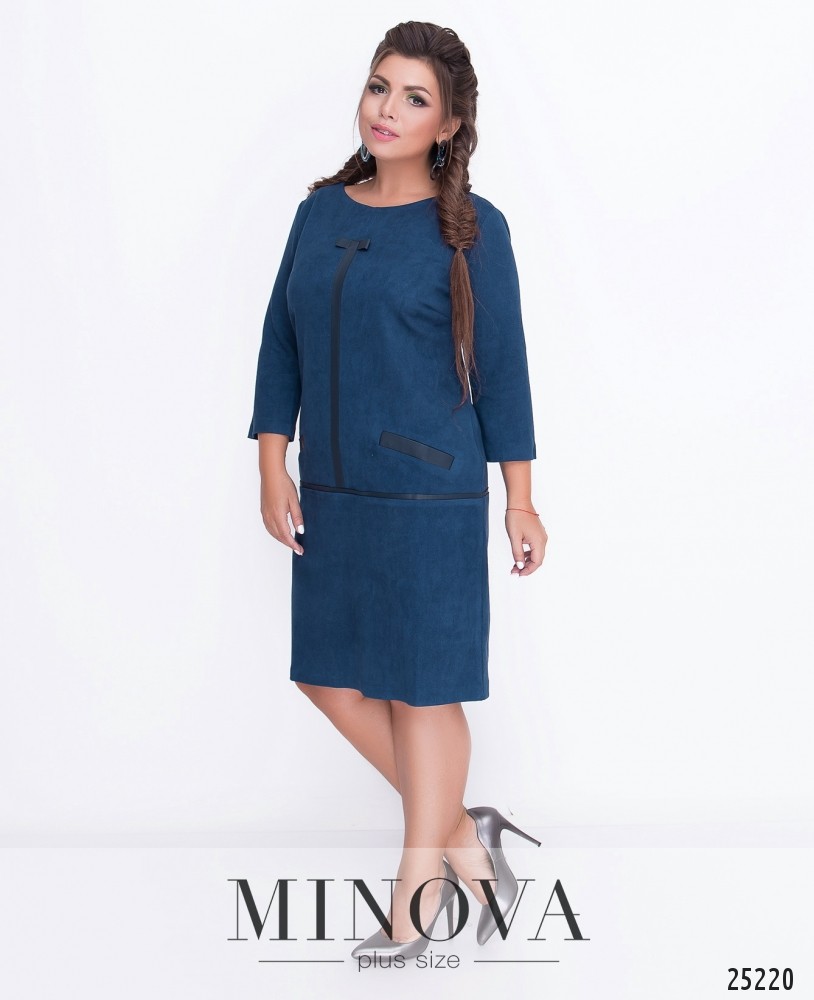Элегантное платье прямого кроя с рукавами ¾ и отрезной заниженной талией. По бокам имитация карманов. Передняя планка декорирована планкой из эко-кожи. По спинке ярко выраженная молния.