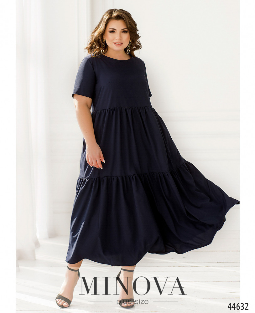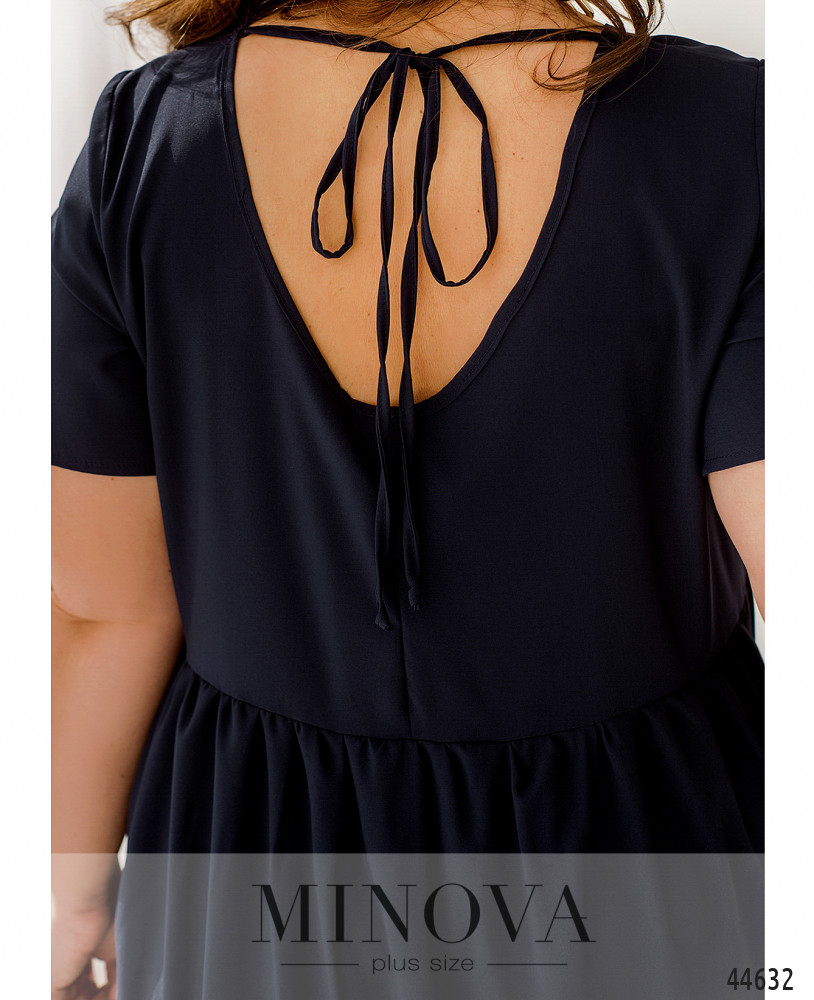 Минималистичное платье батал А-силуэта, подол с мягкими длинными оборками. Рукава короткие, без манжет. Застёжек нет. Сзади на шее подшита лента-завязка. На груди вытачки. Вырез горловины неглубокий.