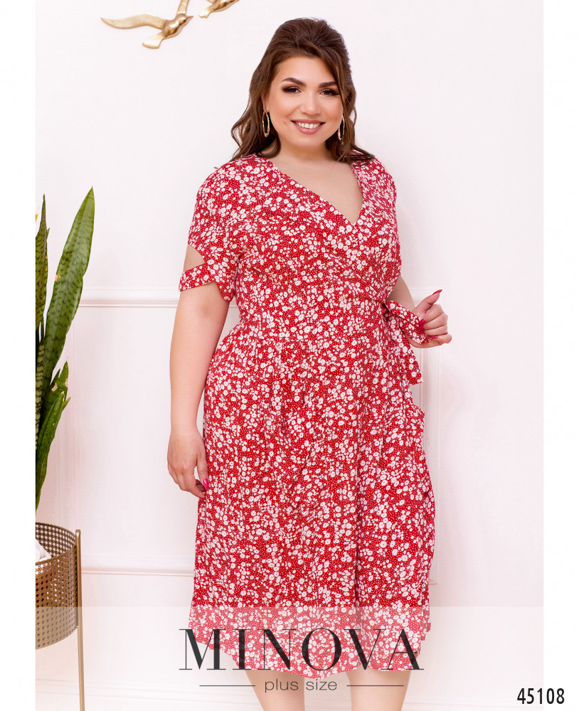 Стильное и яркое платье с цветочным принтом, на запАх, завязывается с помощью ленты, которая продевается в отверстие на талии. Изюминками платья станут отвороты в области декольте, имитирующие лацканы воротника, декоративные вырезы на рукавах и удобные накладные карманы по бокам.