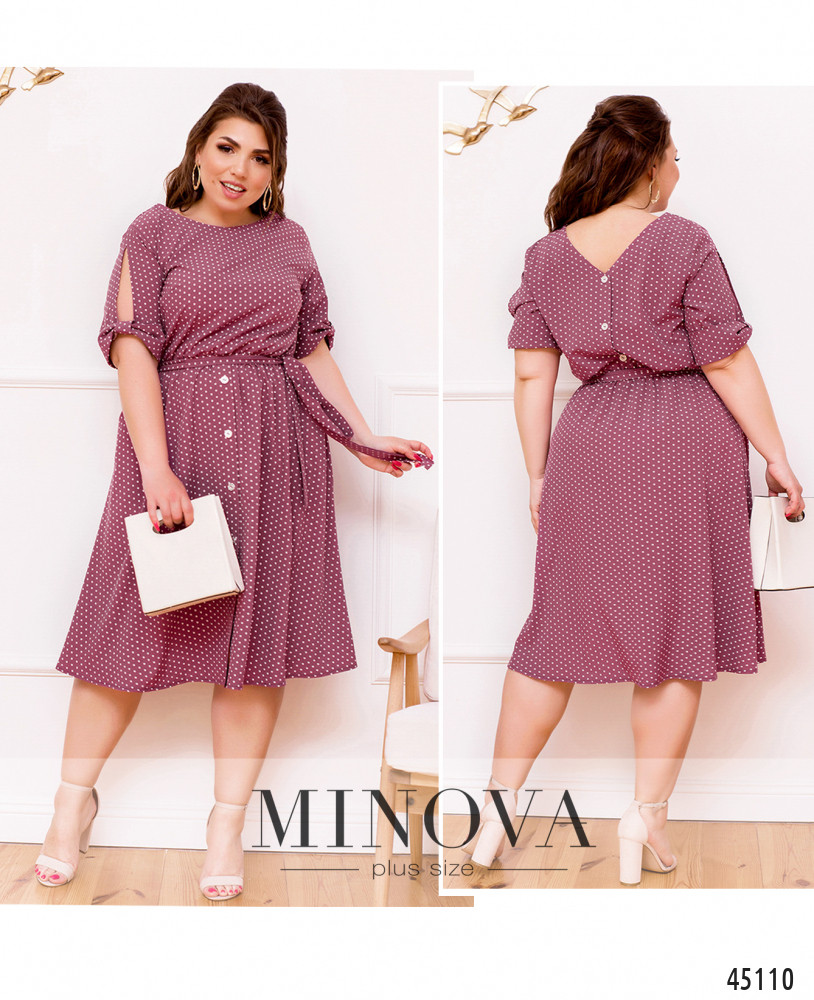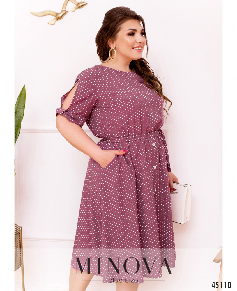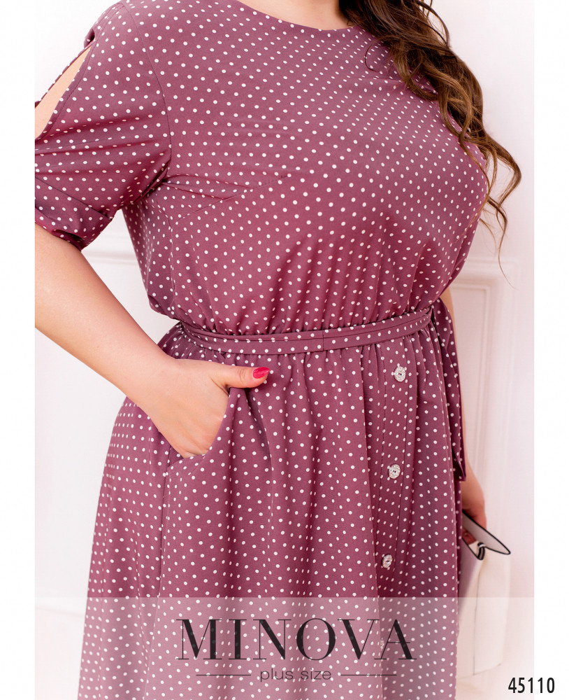 Лёгкое платье большого размера в горошек, украшено декоративными пуговицами на подоле (спереди) и на лифе (по спинке). Вырез горловины спереди полукруглый, сзади V-образный. В пояс вшита резинка, по бокам - врезные карманы. Рукава с прорезями и "бантами"-манжетами. На груди вытачки. Застёжек нет.