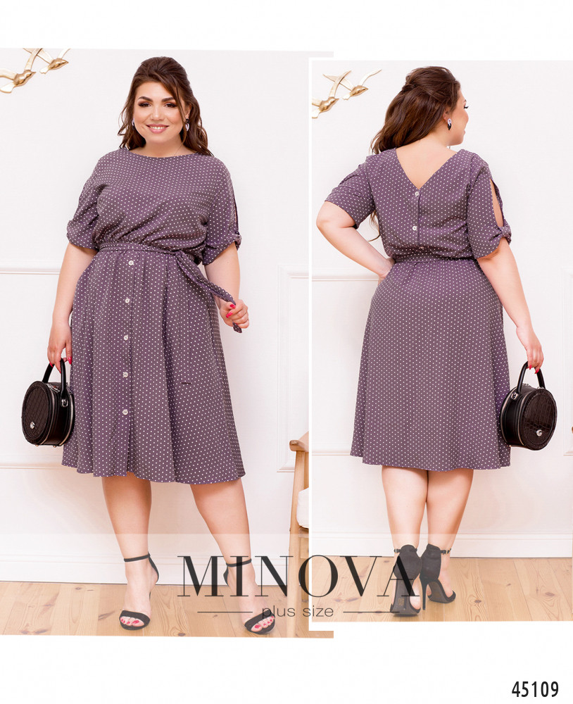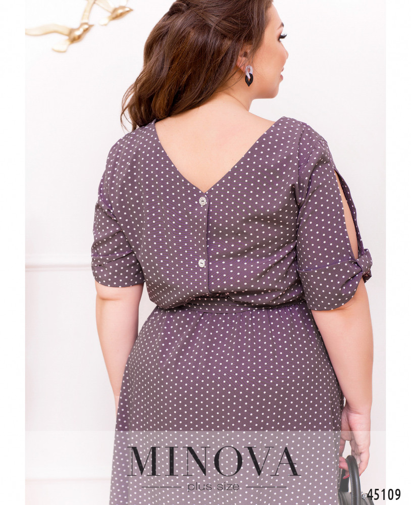 Лёгкое платье большого размера в горошек, украшено декоративными пуговицами на подоле (спереди) и на лифе (по спинке). Вырез горловины спереди полукруглый, сзади V-образный. В пояс вшита резинка, по бокам - врезные карманы. Рукава с прорезями и "бантами"-манжетами. На груди вытачки. Застёжек нет.