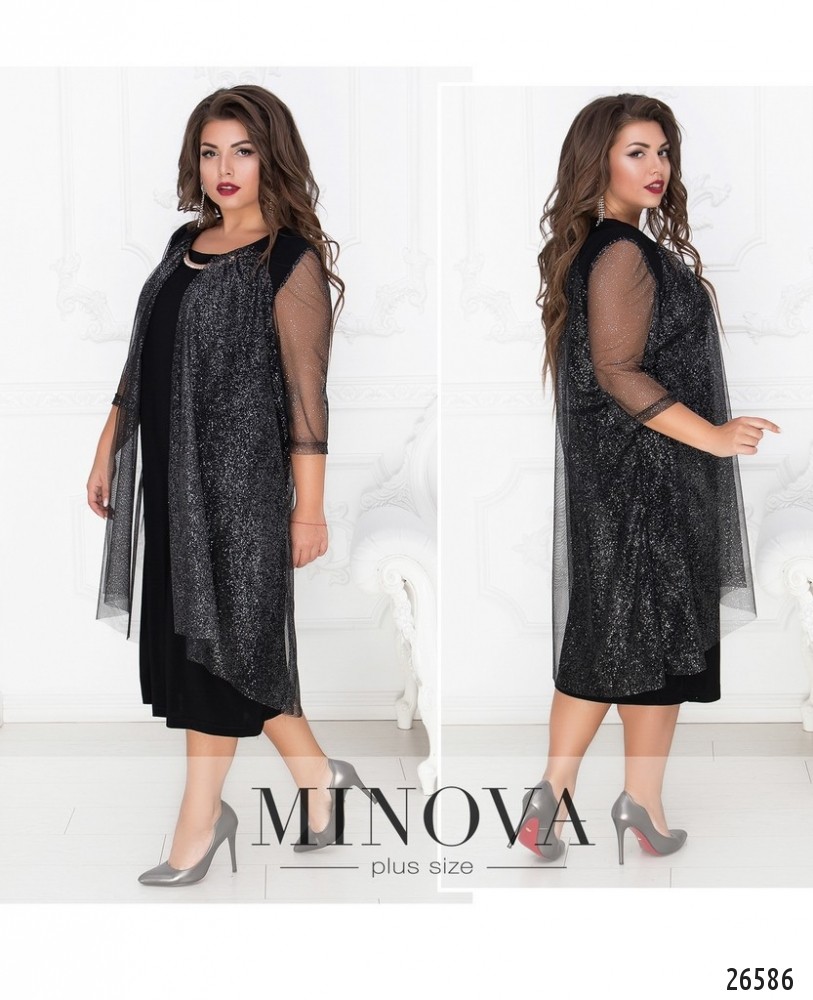 Коктейльное платье свободного кроя с полупрозрачными рукавами 3/4 с манжетами и легкой драпировкой с деликатным блеском. Драпировка пришита к платью и не снимается. Два края драпировки соединяет полукруглая цепочка с кристаллами на горловине. Цепочка не снимается. Платье без молнии.