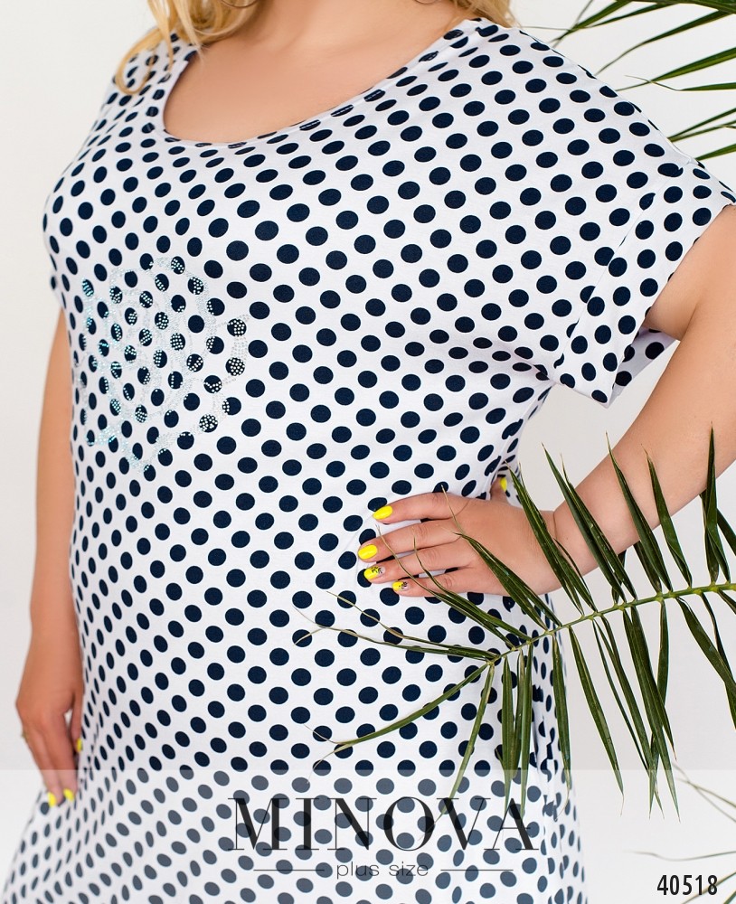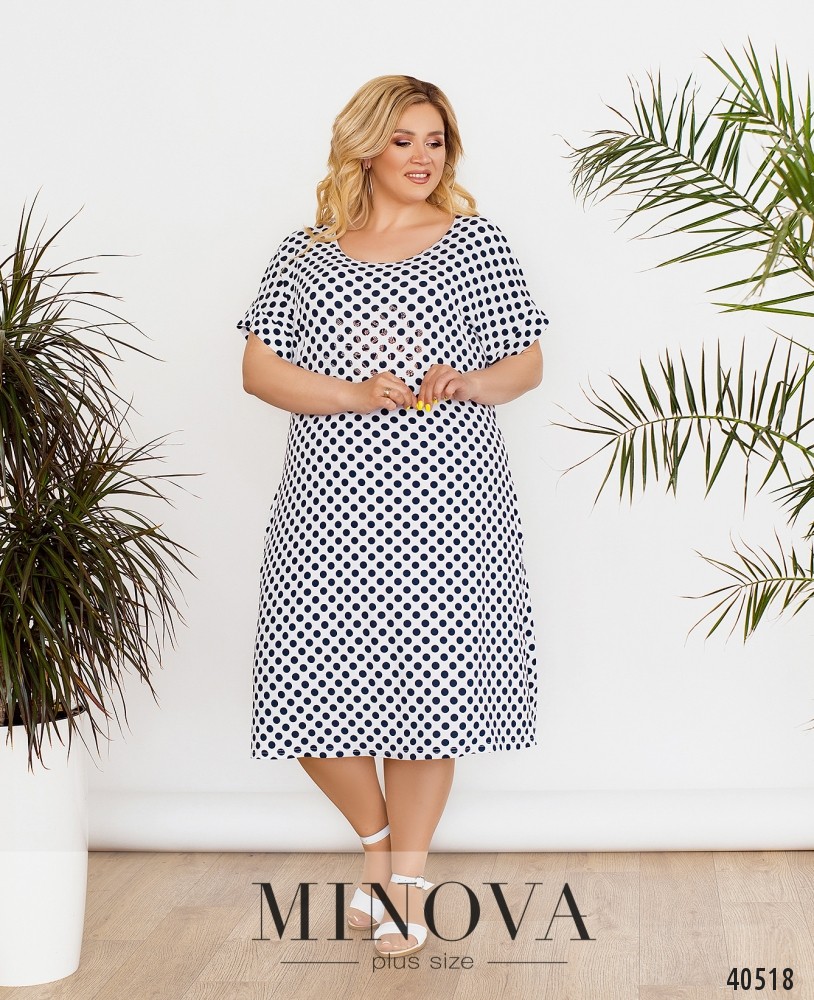 Очаровательное платье батал без застёжек, с вырезом горловины "лодочка", по бокам - врезные карманы, рукава короткие, с отворотами. На груди - едва заметный цветок, выложенный стразами. Украшение входит в комплект.