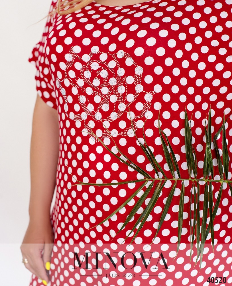 Очаровательное платье батал без застёжек, с вырезом горловины "лодочка", по бокам - врезные карманы, рукава короткие, с отворотами. На груди - едва заметный цветок, выложенный стразами. Украшение входит в комплект.