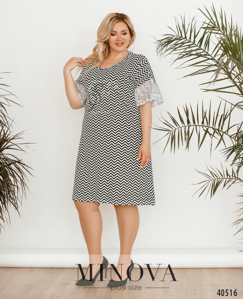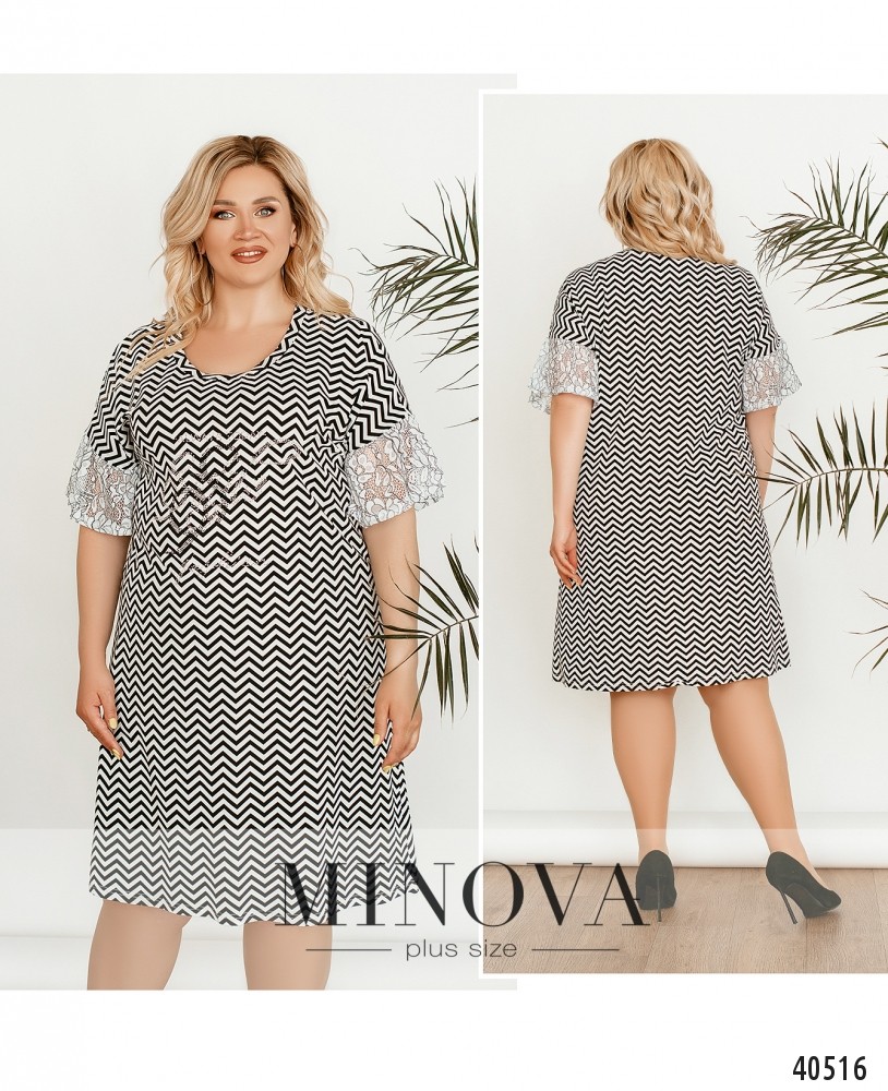 Оригинальное платье батал с узором, выложенным из страз, на груди. Рукава оторочены нежным кружевом. Вырез горловины широкий. Застёжек и карманов нет. Украшение входит в комплект.