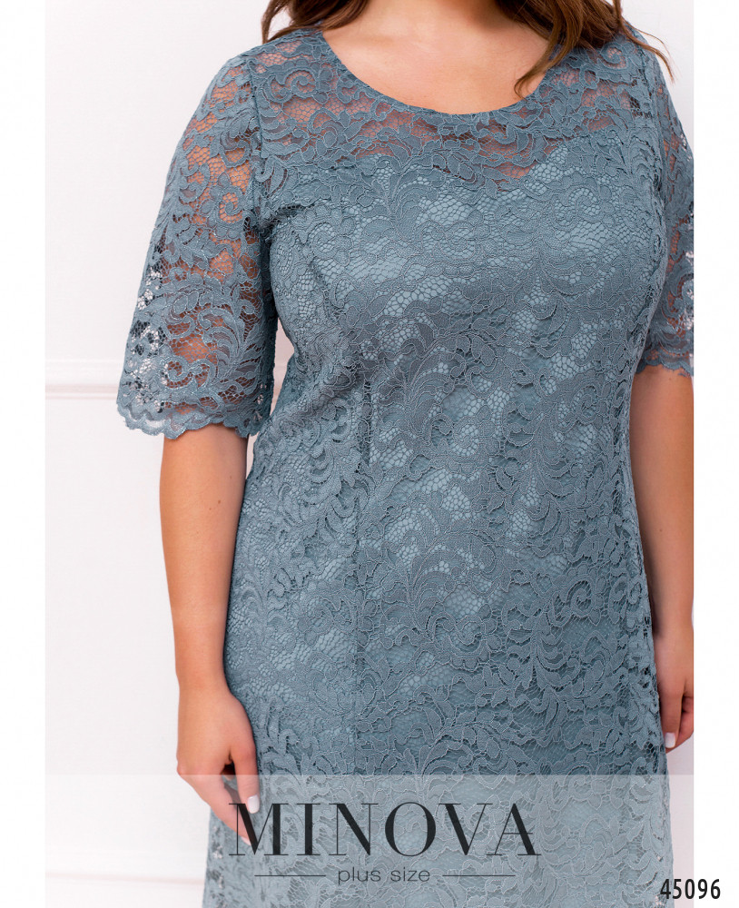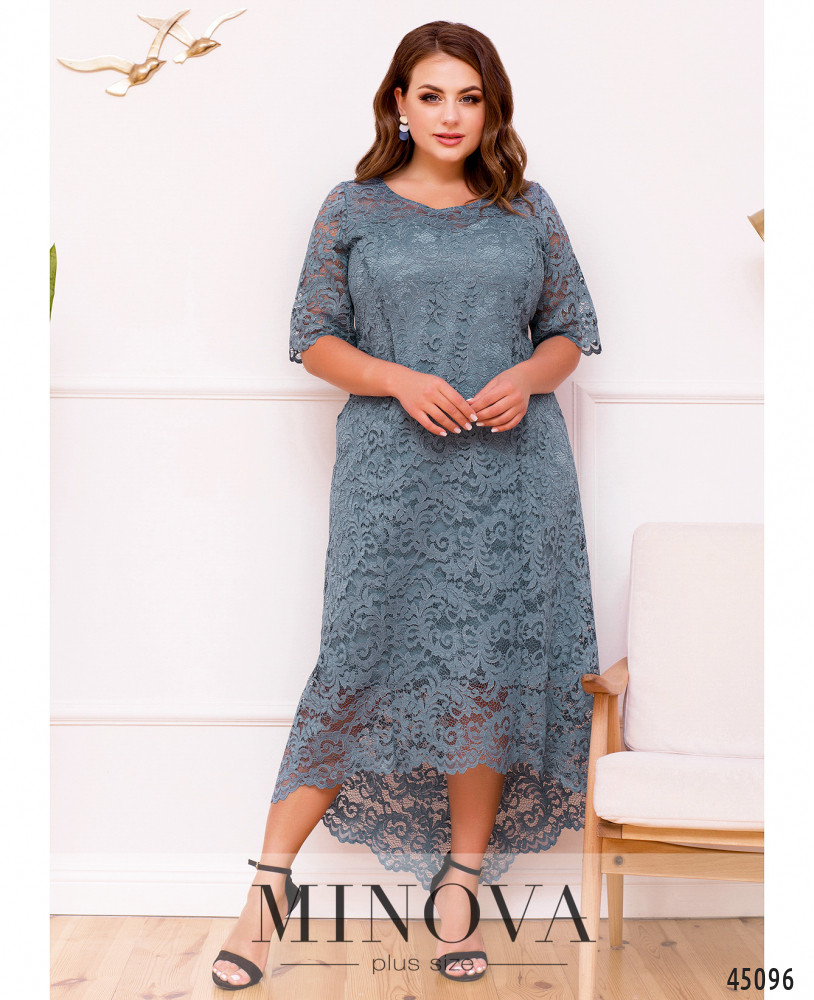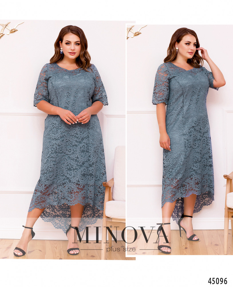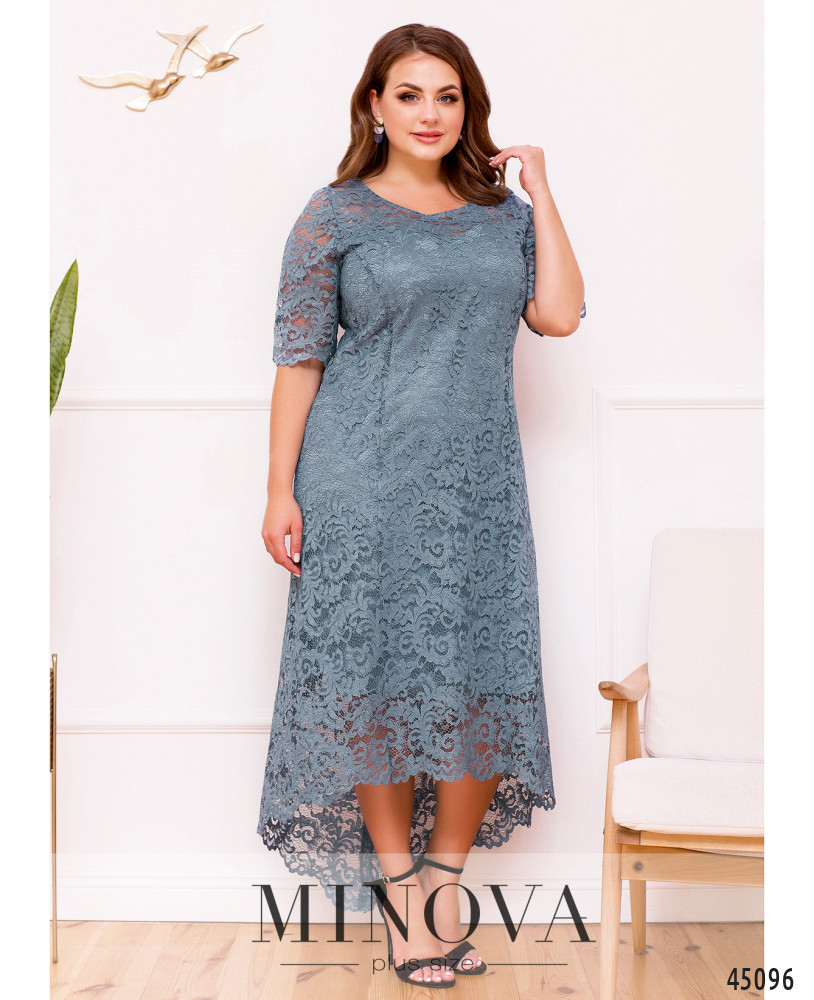 Нарядное платье батал без карманов с мягкой подкладкой и кружевом. Рукава без подкладки. Застёгивается на вшитую по спинке змейку. Подол асимметричный, по спинке длиннее.