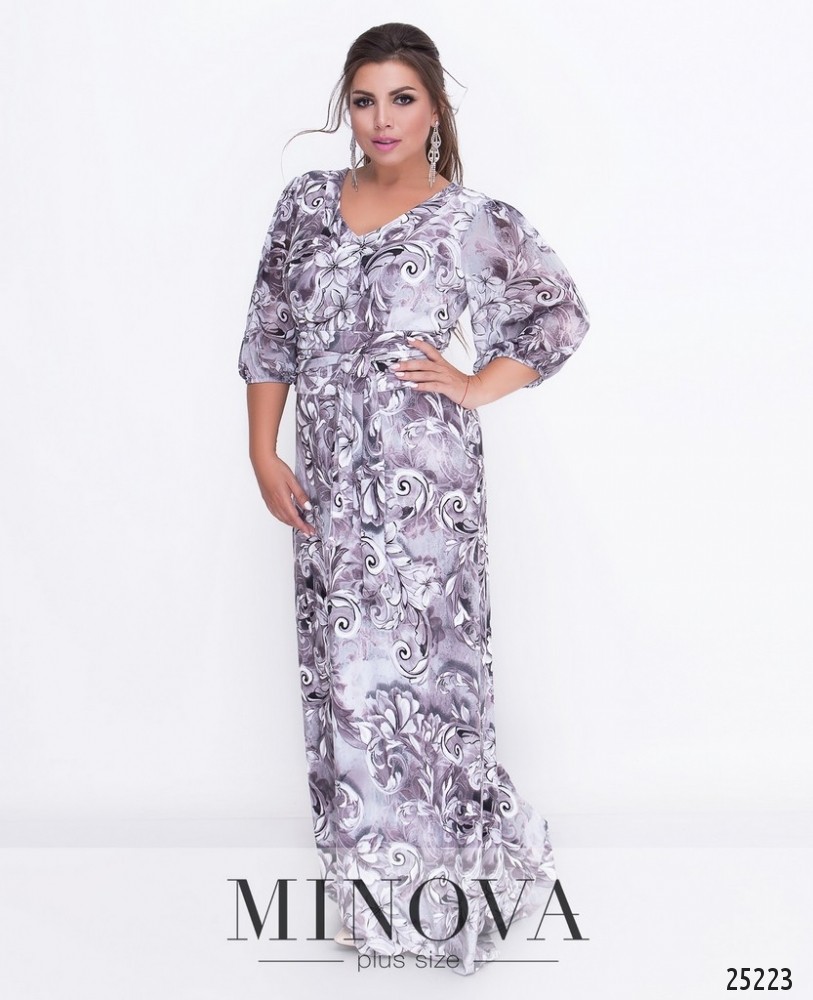Эффектное приталенное платье-макси с V-образным декольте и рукавами-фонариками до локтя. Рукава собраны на резинку. К платью прилагается съемный пояс-кушак. Платье без молнии. Данная модель подходит для торжественных мероприятий.