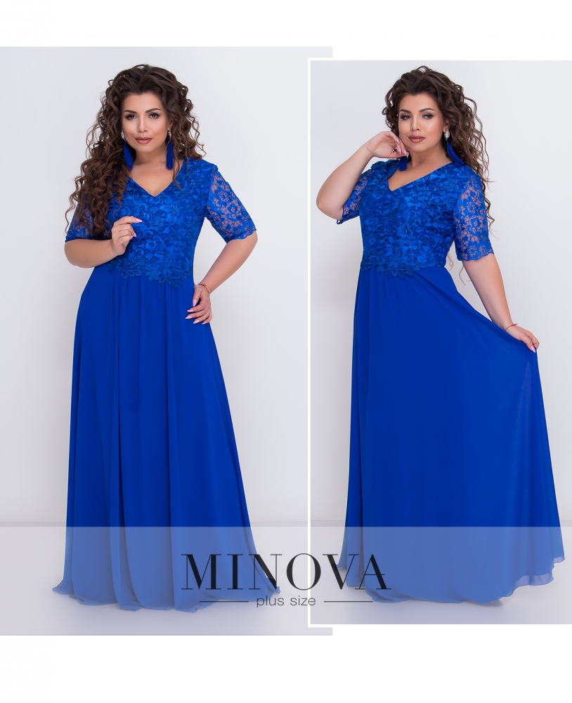 Женственное платье-макси с кружевным лифом. Верх платья с V-образным декольте дополнен изящным кружевом. Отрезной от талии подол изготовлен из двух слоев струящейся ткани. Рукава длиной до локтя изготовлены из кружева. На спинке платье застегивается на скрытую молнию.
