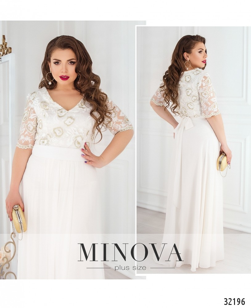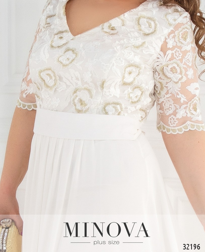 Деликатное, женственное платье-макси с кружевным топом. Верх платья с V-образным декольте выполнен с подкладкой и дополнен изящным кружевом с вышивкой. Отрезной от талии подол изготовлен из двух слоев струящейся ткани. Короткие рукава изготовлены из кружева. Талия дополнена съемным поясом в тон. Платье застегивается на скрытую молнию на спине.
