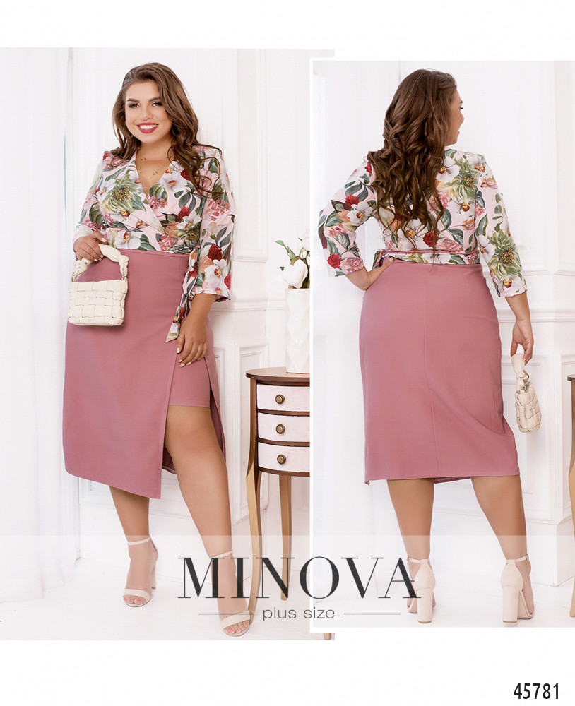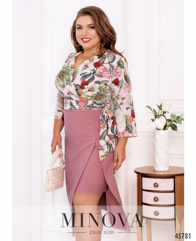 Женственное приталенное платье выполнено из двух видов тканей: однотонной и с контрастным принтом. Яркий лиф, подшитый на запах, с рукавами 3-4 дополнен необычным однотонным подолом, выполненным в виде двуслойной юбки с разрезом на верхнем слое. Текстильный пояс, делающий акцент на талии, пришит к платью по бокам