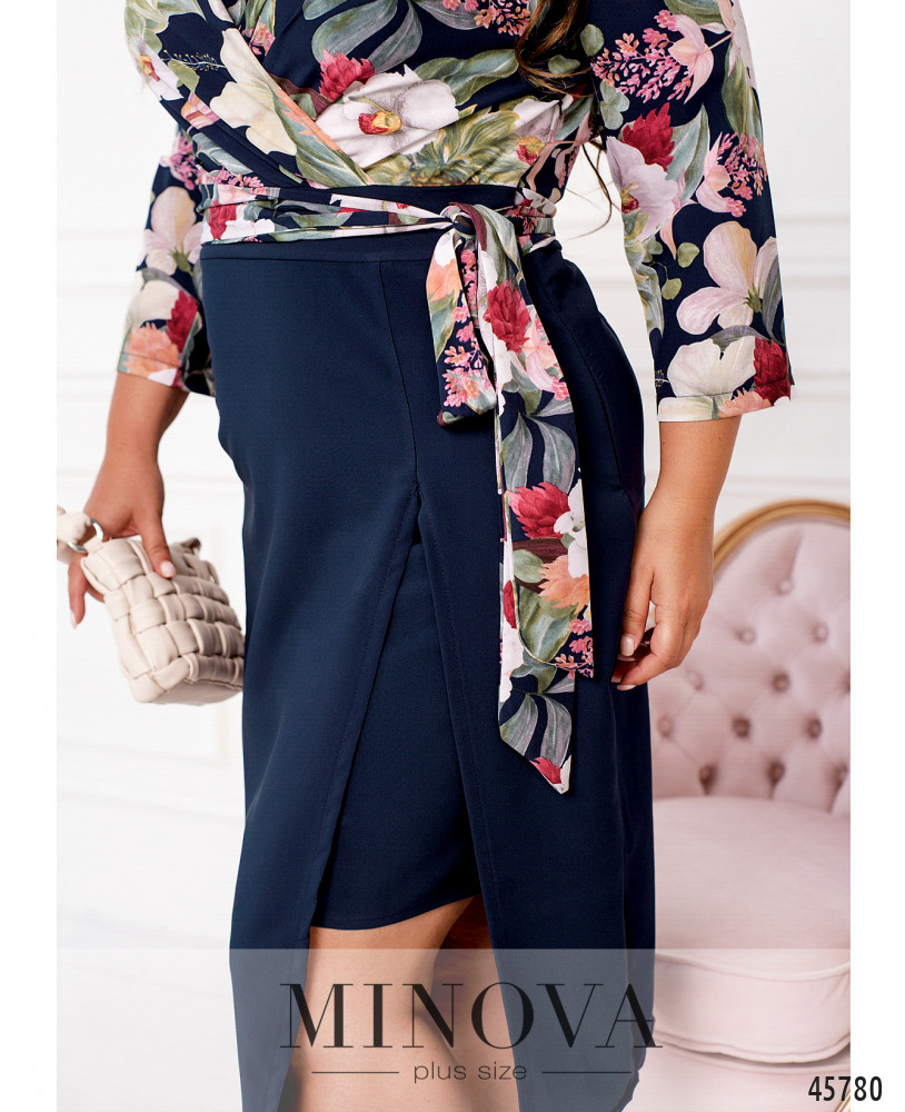 Женственное приталенное платье выполнено из двух видов тканей: однотонной и с контрастным принтом. Яркий лиф, подшитый на запах, с рукавами 3-4 дополнен необычным однотонным подолом, выполненным в виде двуслойной юбки с разрезом на верхнем слое. Текстильный пояс, делающий акцент на талии, пришит к платью по бокам