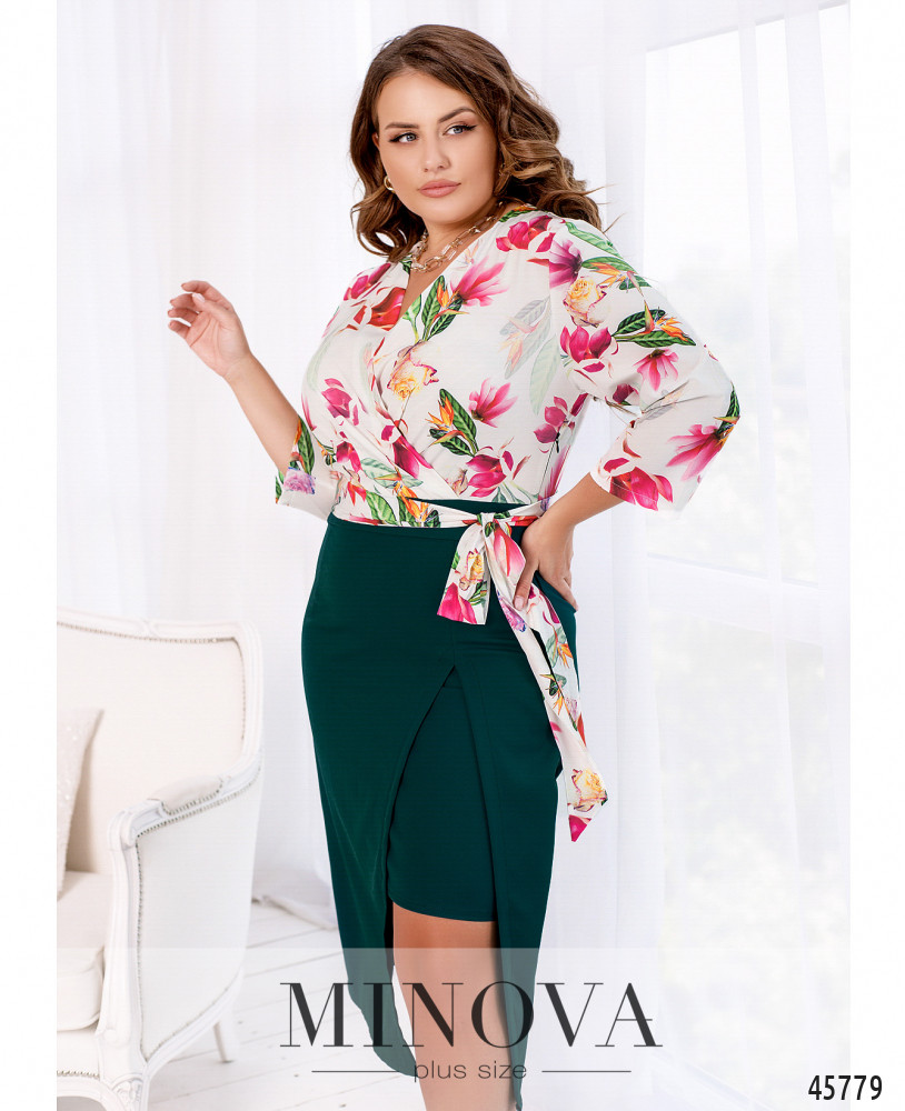 Женственное приталенное платье выполнено из двух видов тканей: однотонной и с контрастным принтом. Яркий лиф, подшитый на запах, с рукавами 3-4 дополнен необычным однотонным подолом, выполненным в виде двуслойной юбки с разрезом на верхнем слое. Текстильный пояс, делающий акцент на талии, пришит к платью по бокам