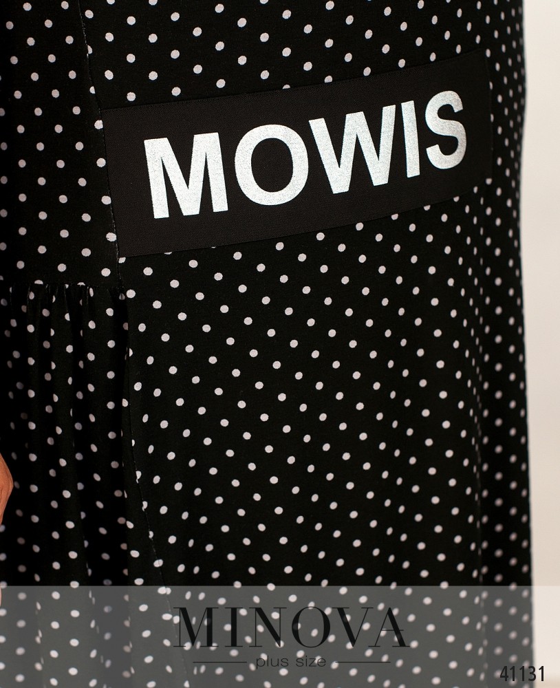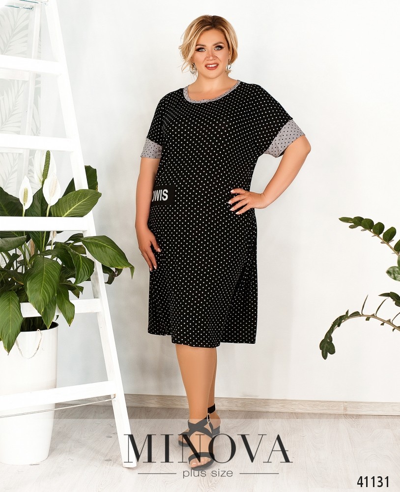 Очаровательное повседневное платье большого размера с оборками по спине на подоле. Декорировано лентой с принтом сбоку. Платье в горошек. Рукава и горловина оторочены контрастной тканью. Застёжек и карманов нет.