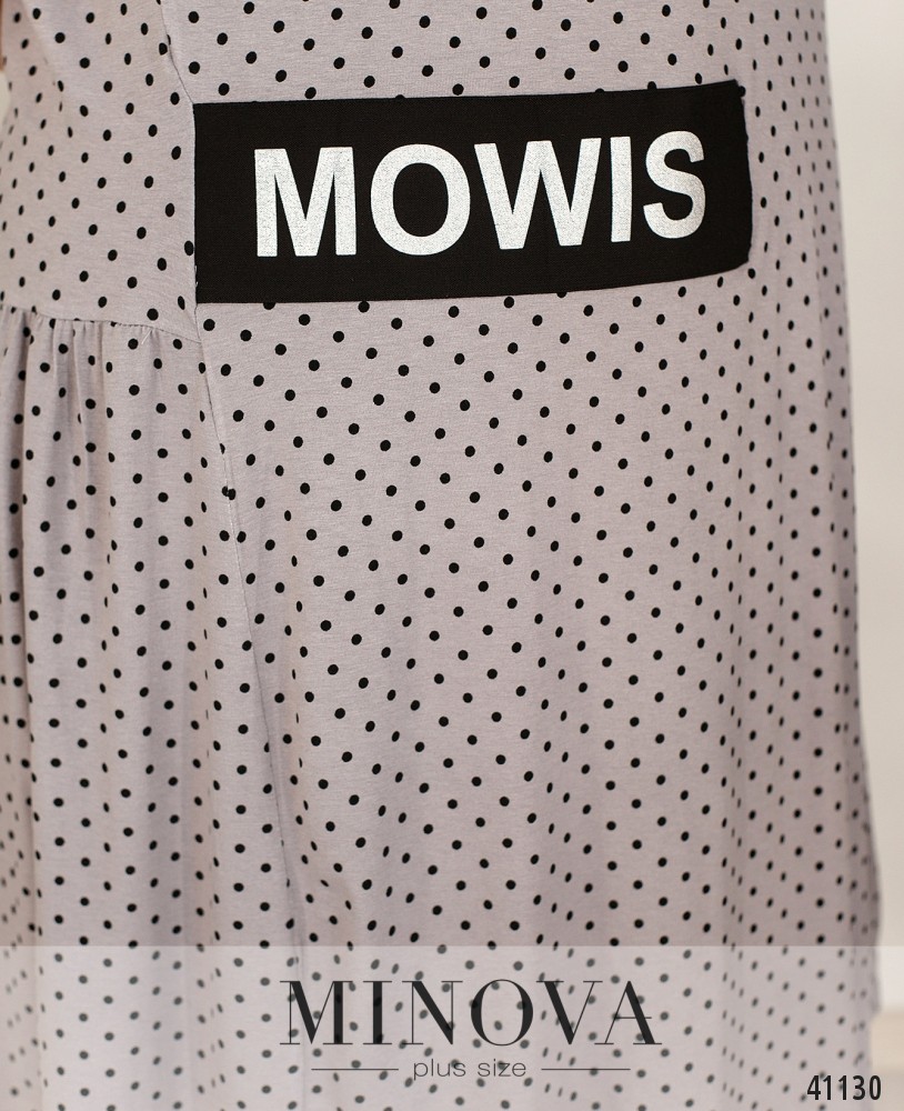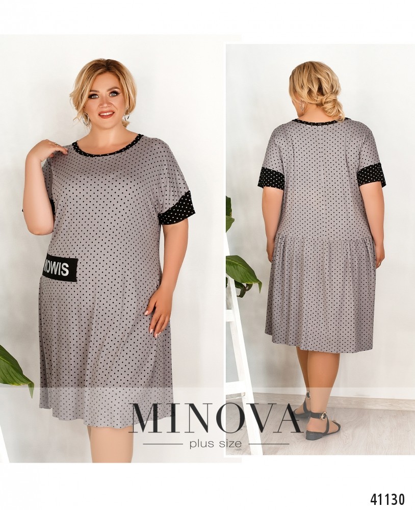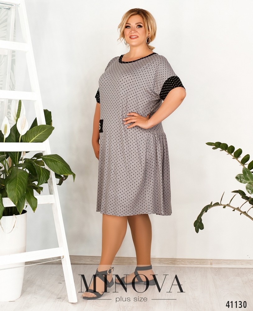 Очаровательное повседневное платье большого размера с оборками по спине на подоле. Декорировано лентой с принтом сбоку. Платье в горошек. Рукава и горловина оторочены контрастной тканью. Застёжек и карманов нет.