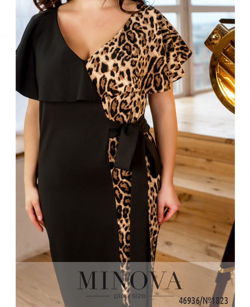 Длинное платье сразу добавляет фигуре изящества и несколько сантиметров роста визуально! Обрати внимание на новую модель платья батал в каталоге Minova. Платье из очень мягкой, слегка эластичной ткани, без карманов и застёжек. Визуально разделена на две части: левая, более узкая, украшена анималистичным контрастным принтом, переходящим на рукав. Правая – однотонная. Рукава ниспадают мягкими оборками, не длинные, прикрывают плечи и сходятся на спине. На спинке также видно разделение по цвету – только на рукавах. Вырез горловины V-образный, не очень глубокий, застёжек и карманов нет. Ещё одна изюминка наряда – подшитый пояс на уровне высокой талии, который можно завязать бантом сбоку. На подоле слева – довольно длинный разрез. Платье будет прекрасно смотреться на любой фигуре.