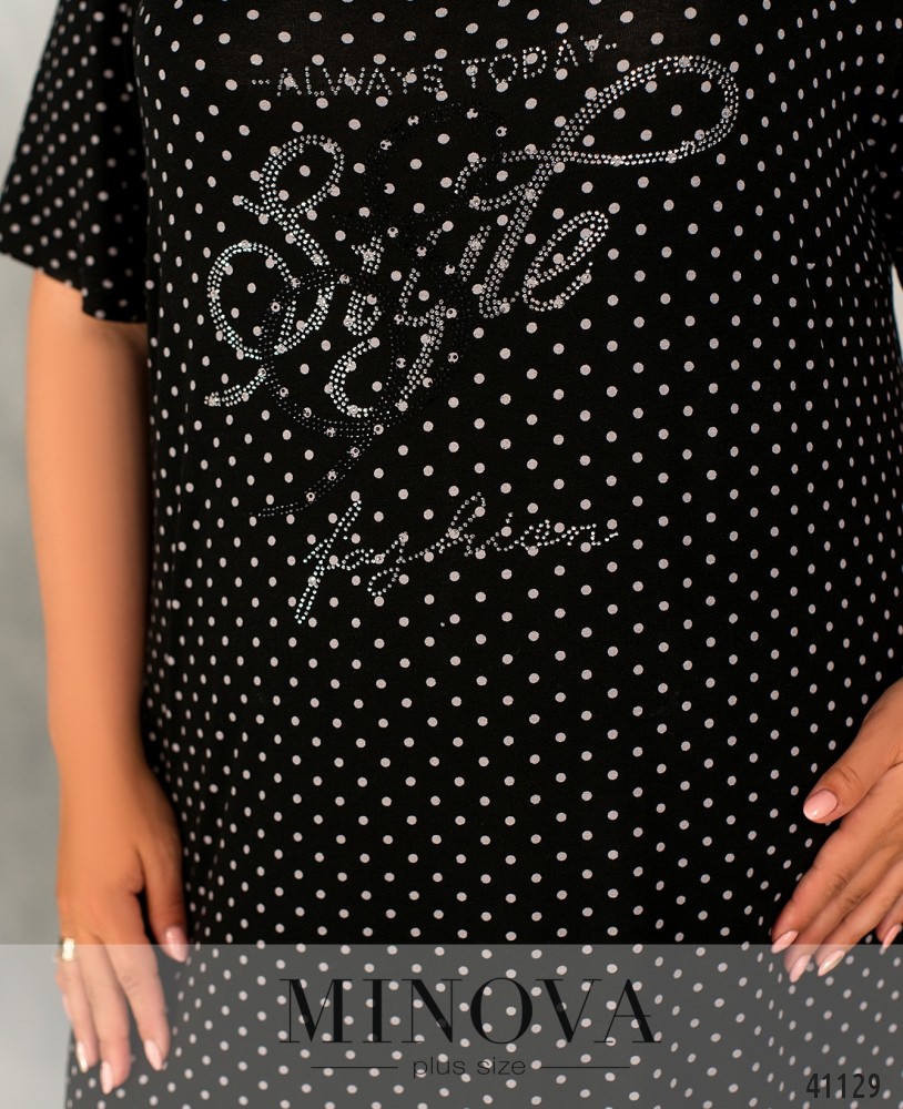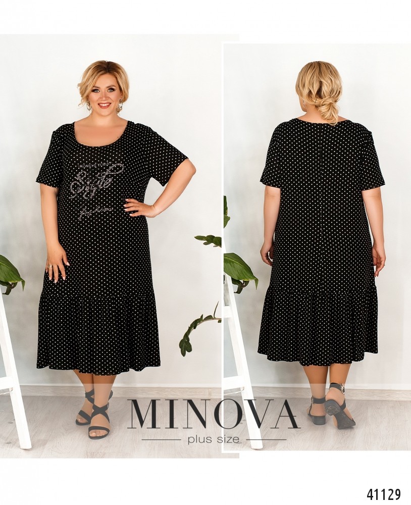 Мягкое и удобное повседневное платье батал в горошек, украшено узором из страз на груди, вырез горловины глубокий, полукруглый. Застёжек и карманов нет, рукава без манжет, подол украшен мягкими длинными оборками.