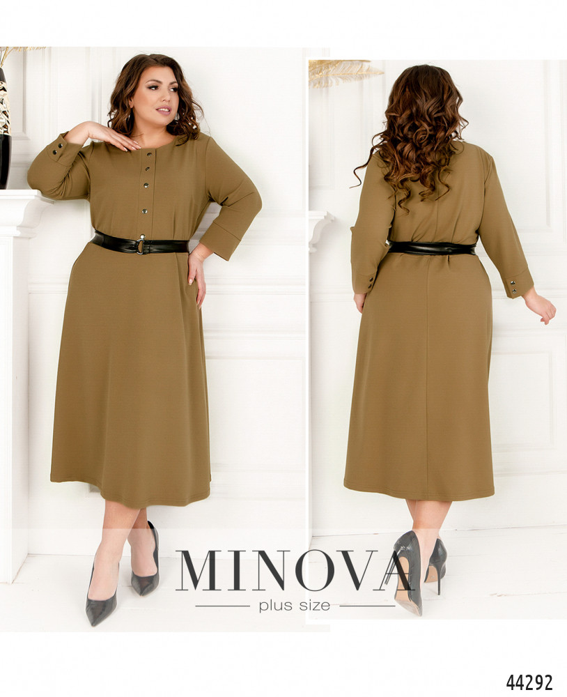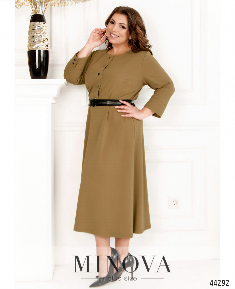 Минималистичное платье батал без застёжек и карманов, кнопки спереди на планке декоративные. Рукава с мягкими манжетами, на манжетах по две декоративных кнопки, на груди вытачки. Подол отрезной. Вырез горловины полукруглый.