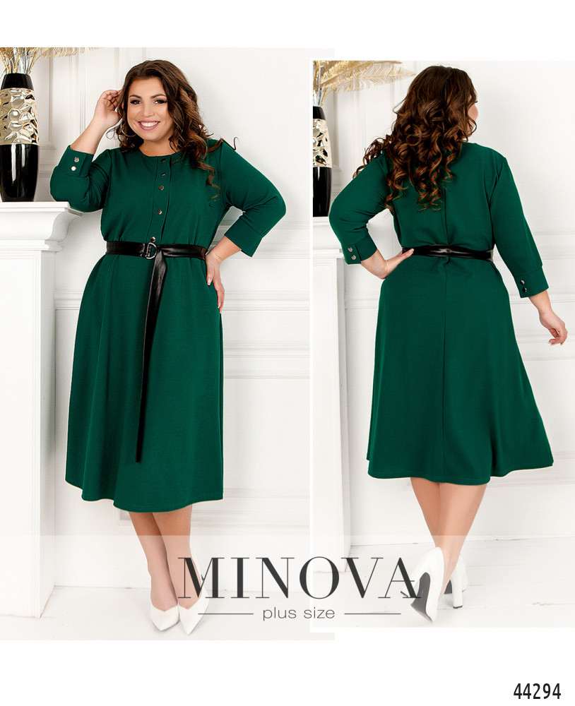 Минималистичное платье батал без застёжек и карманов, кнопки спереди на планке декоративные. Рукава с мягкими манжетами, на манжетах по две декоративных кнопки, на груди вытачки. Подол отрезной. Вырез горловины полукруглый.
