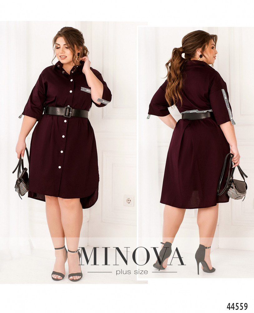 Стильное платье батал в стиле рубашки: отложной воротничок, ряд кнопок спереди на планке. На груди накладной карман. Карман и рукава, а также отрезной по спинке подол украшены декоративной лентой. Подол по спинке расходится от оборки по центру. По бокам подола - небольшие скруглённые разрезы. Карманов по бокам нет.
