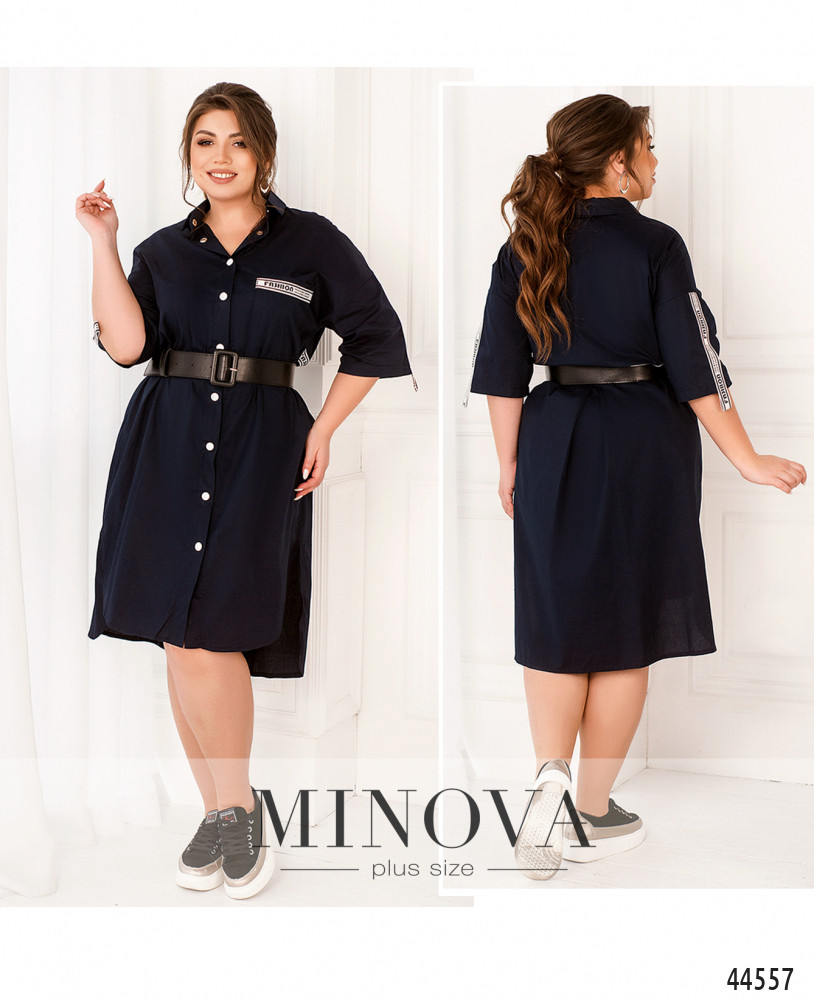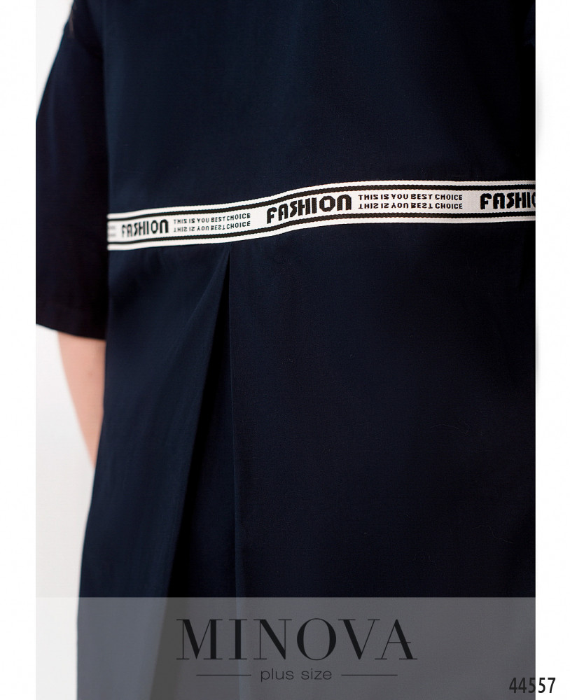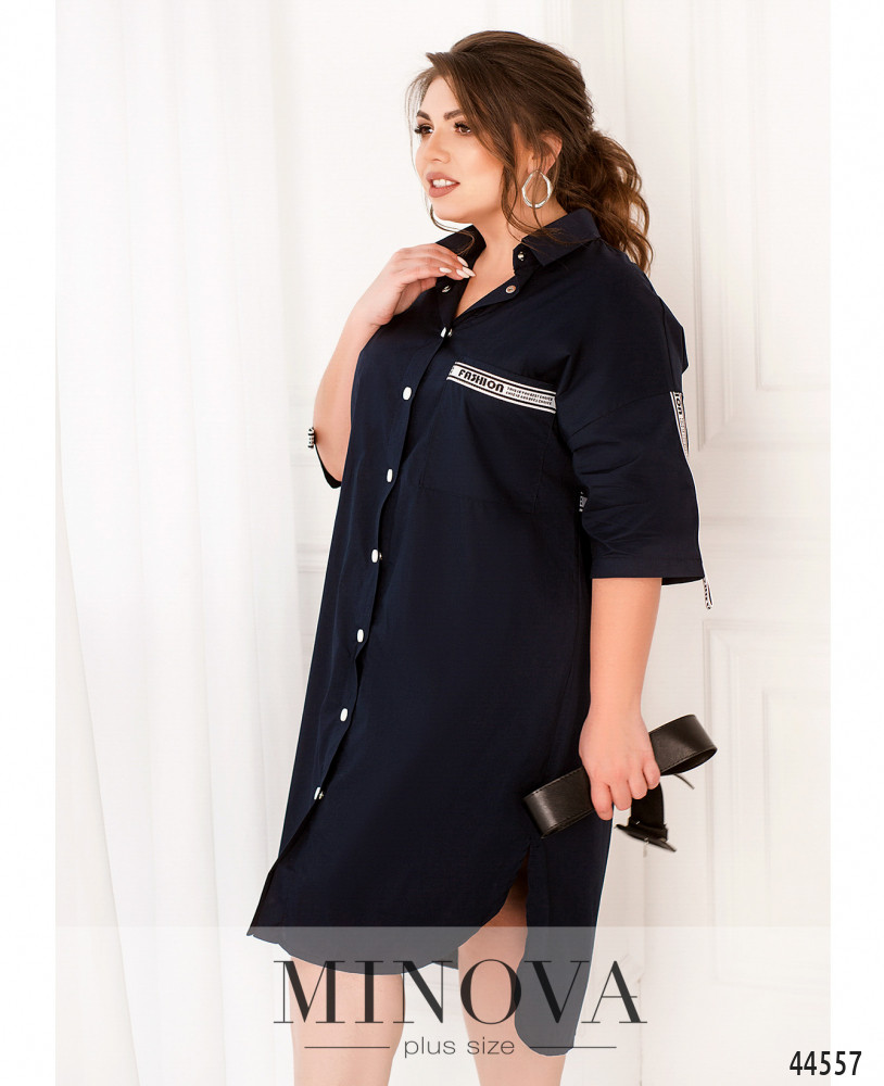 Стильное платье батал в стиле рубашки: отложной воротничок, ряд кнопок спереди на планке. На груди накладной карман. Карман и рукава, а также отрезной по спинке подол украшены декоративной лентой. Подол по спинке расходится от оборки по центру. По бокам подола - небольшие скруглённые разрезы. Карманов по бокам нет.