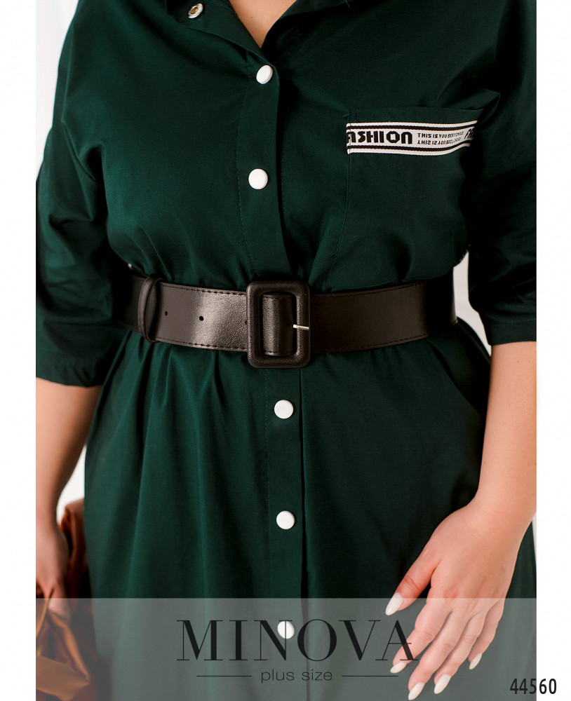 Стильное платье батал в стиле рубашки: отложной воротничок, ряд кнопок спереди на планке. На груди накладной карман. Карман и рукава, а также отрезной по спинке подол украшены декоративной лентой. Подол по спинке расходится от оборки по центру. По бокам подола - небольшие скруглённые разрезы. Карманов по бокам нет.