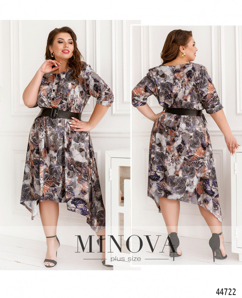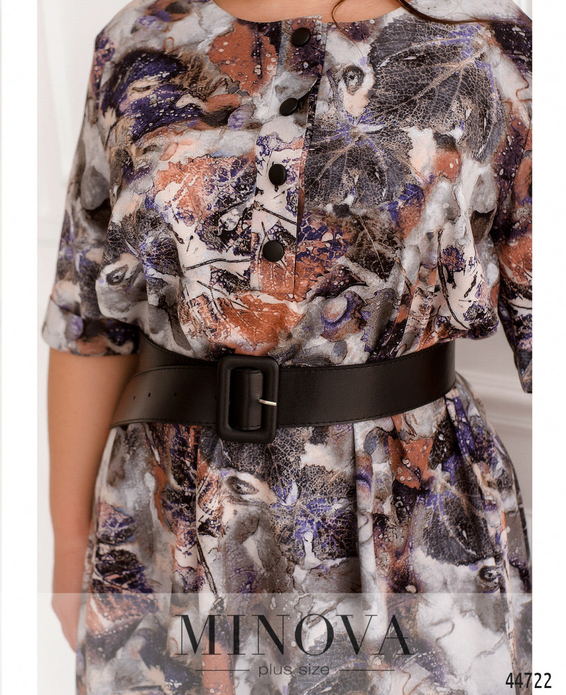 Оригинальное и яркое платье батал с полукруглым вырезом горловины, застёгивается на ряд кнопок спереди на планке, от выреза до середины груди. Рукава с небольшими манжетами. Подол асимметричный, по бокам длиннее. Карманов нет.