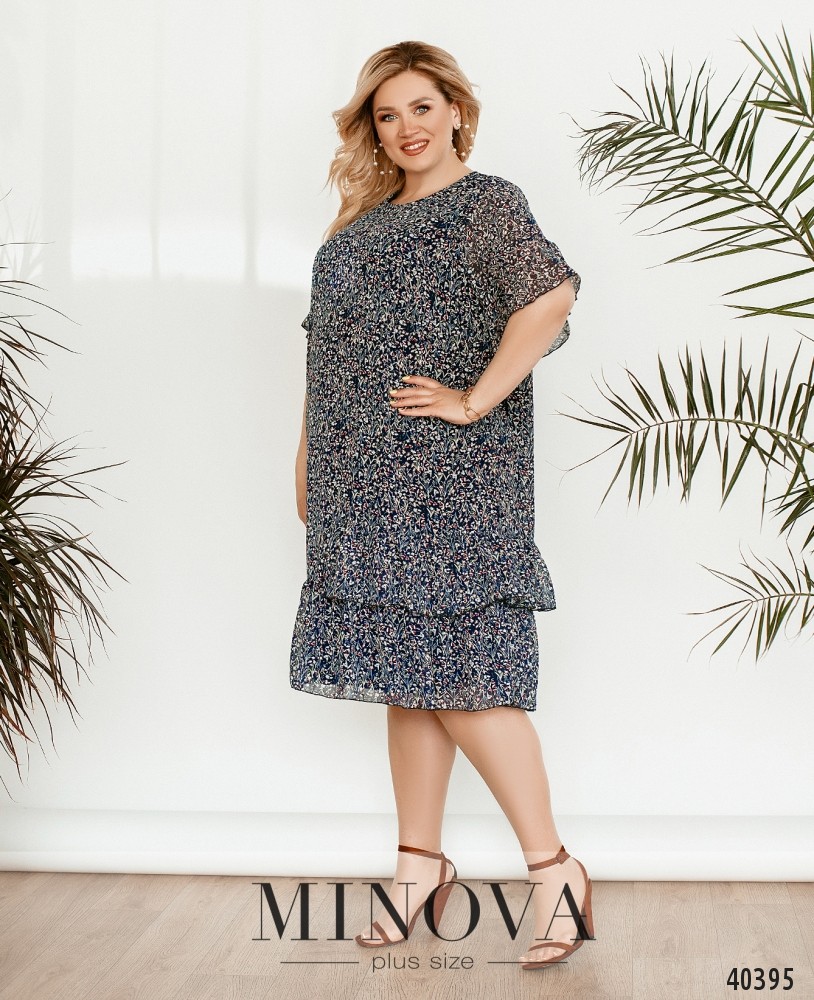 Лёгкое и удобное платье батал с мягкой нижней тканью и полупрозрачной верхней. Подол и рукава украшены оборками, которые на подоле начинаются сбоку. Вырез горловины полукруглый. Карманов нет. Застёжка - пуговка сзади под шеей.