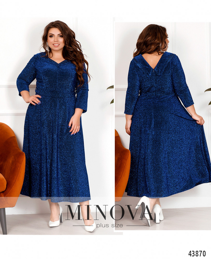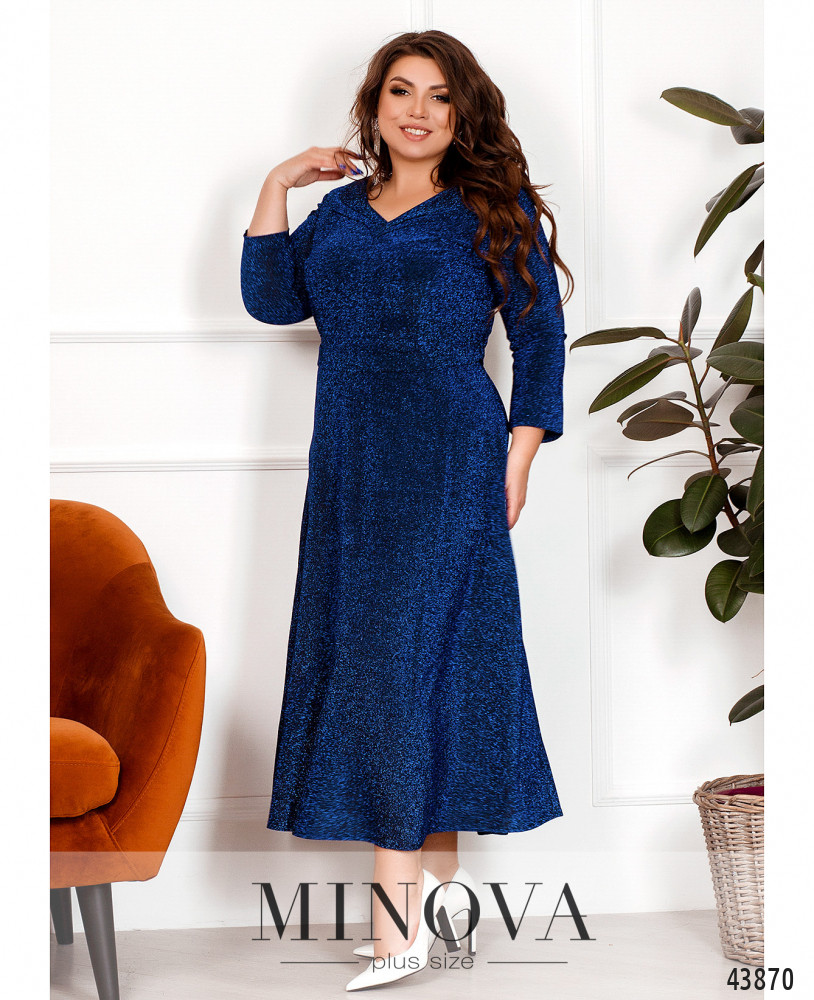 Нарядное платье приталенного силуэта с V-образным вырезом спереди и по спине. На талии подшит поясок. Змейка вшита по спинке, карманов нет. Ткань украшена люрексом. Рукава без манжет. Спереди на груди продольные вытачки.