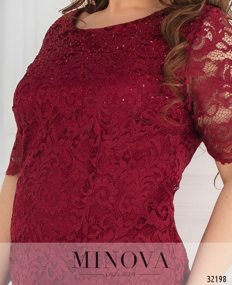Платье из гипюра на подкладке. Платье с короткими рукавами изготовлено на подкладке. Подол украшен плиссированной оборкой. Горловина и подол украшены блестящими мелкими камушками. Платье застегивается на скрытую боковую молнию.