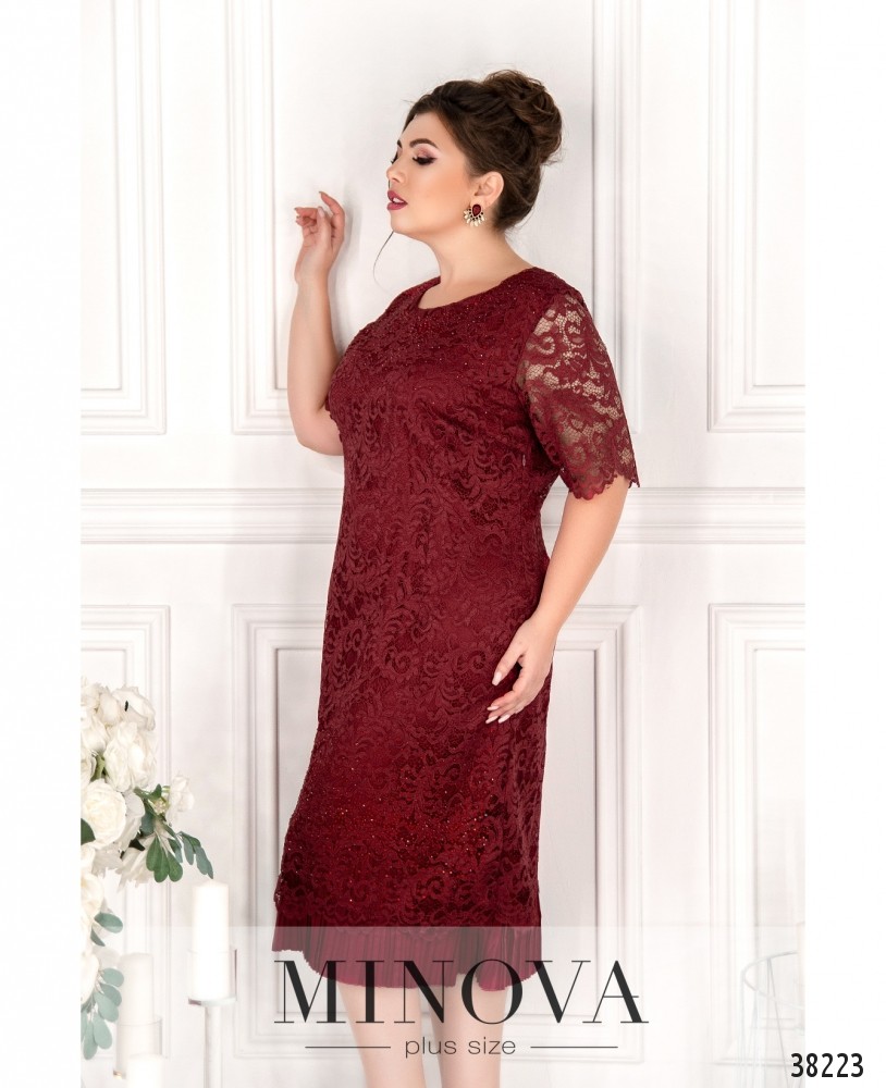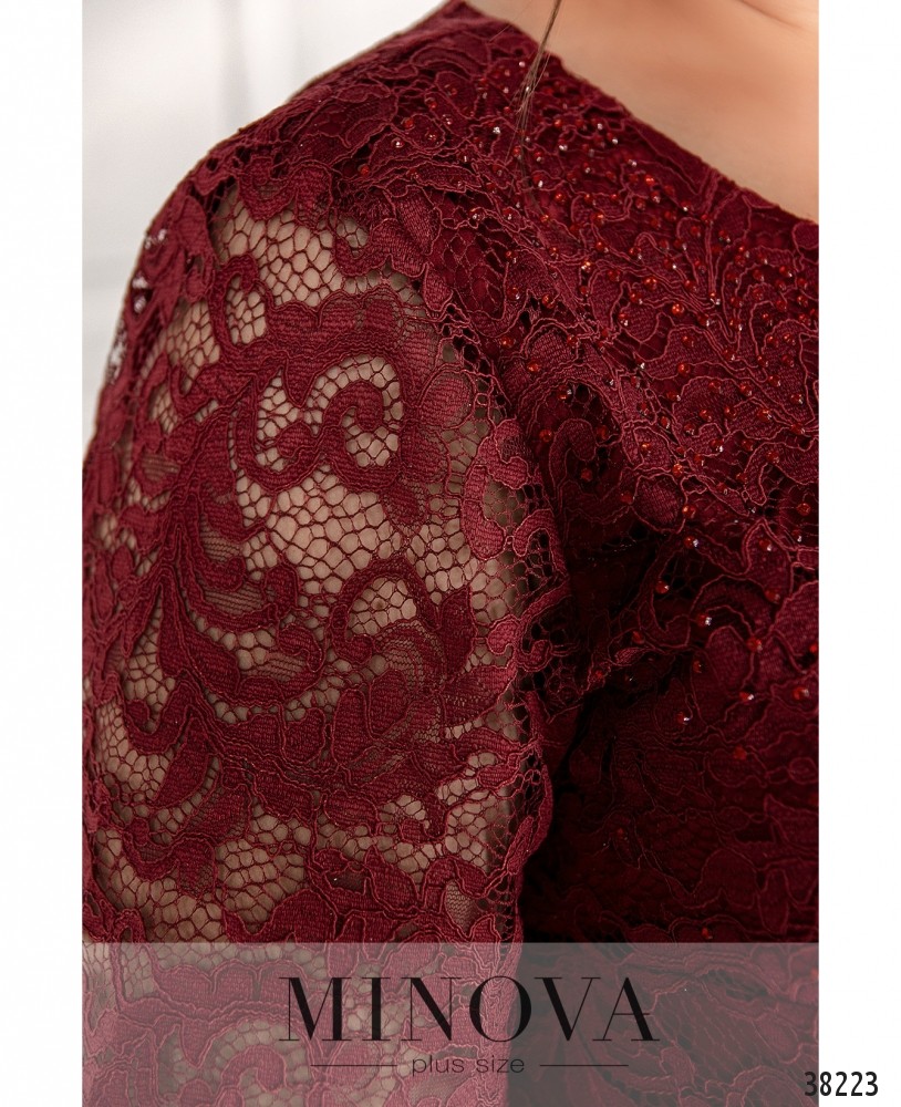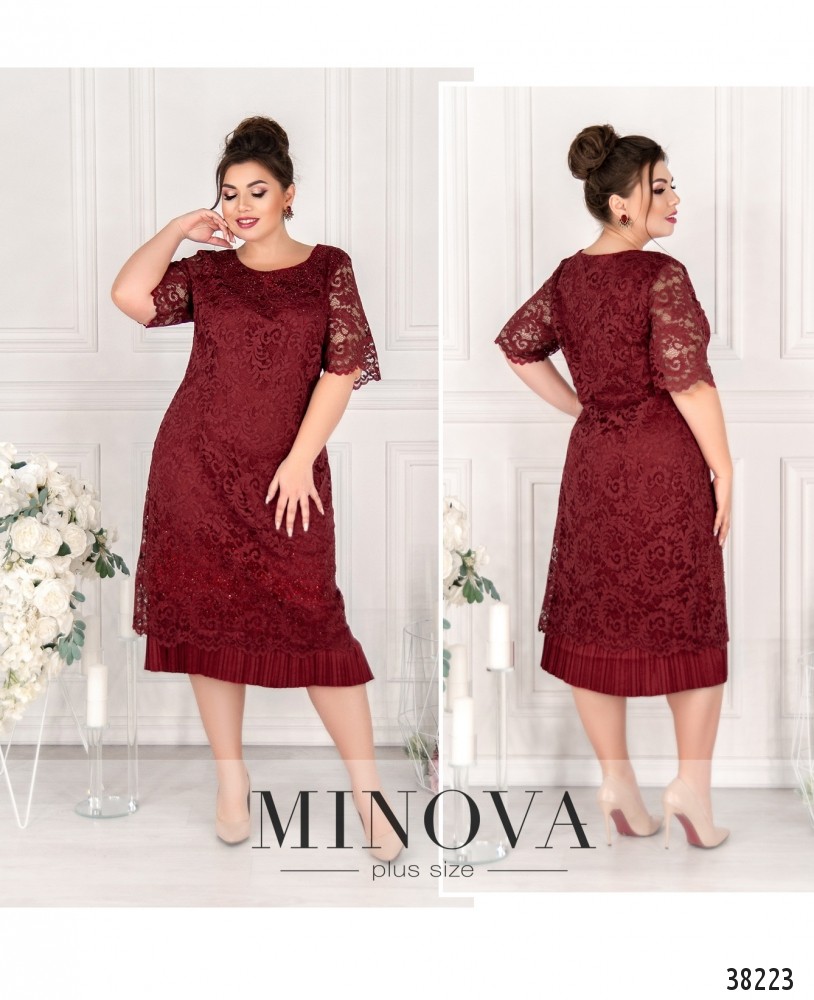 Нарядное платье батал с гипюром и подкладкой, сверху и на подоле – мелкие блестящие стразы. Застёжек и карманов нет. Рукава без подкладки. По низу подкладка украшена плиссировкой. Вырез горловины полукруглый.