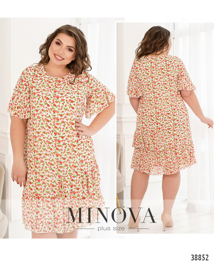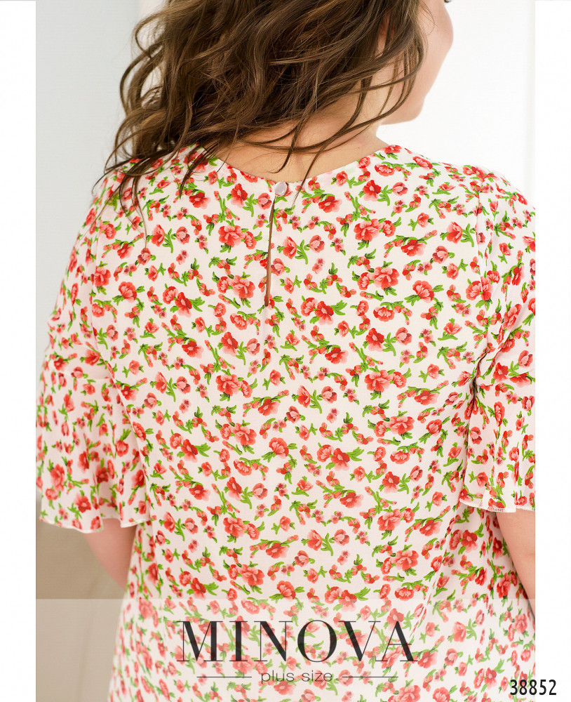 Оригинальное платье батал с расклешёнными рукавами, с мягкой подкладкой и полупрозрачным верхним слоем. Застёжка - пуговка сзади под шеей. Вырез горловины полукруглый, карманов нет. Подол украшен двумя рядами мягких оборок.
