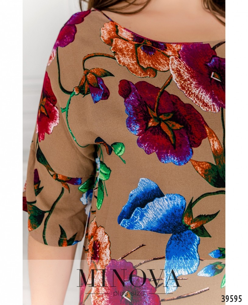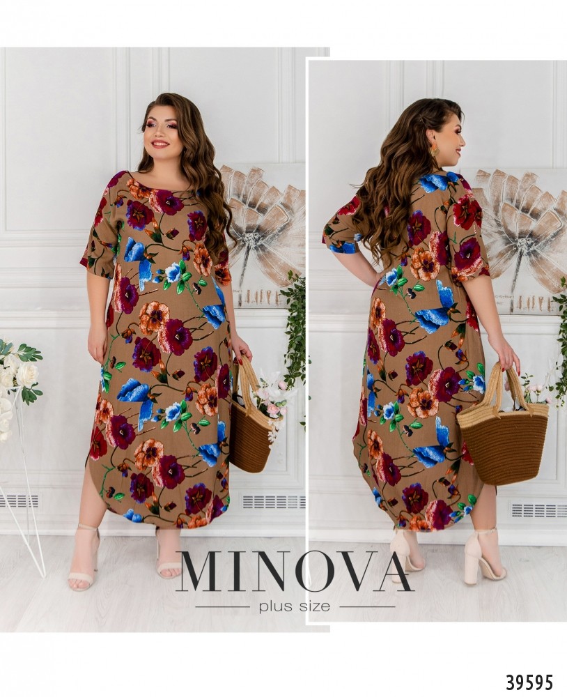 Радостное летнее платье большого размера с вырезом горловины "лодочка", крой свободный, по бокам - врезные карманы, застёжек нет, рукава без манжет.