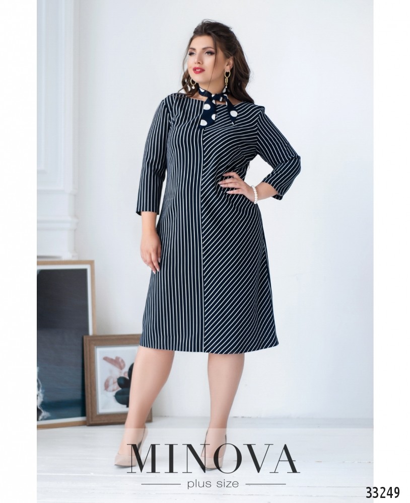 Визуальные эффекты принта – мощный инструмент для создания необычного образа! Представленная модель платья от Minova прекрасно это иллюстрирует. Платье состоит из двух частей: левая – с прямыми продольными тонкими полосками, а правая – с диагональными, на обоих рукавах длиной ¾ - продольные, что создаёт неожиданный вау-эффект. Вырез горловины широкий, полукруглый, на груди – вытачки, карманов нет. Материал очень лёгкий, не тянется. Платье такого фасона идеально подойдёт девушкам с «прямоугольной» фигурой или типом «яблоко», но в принципе хорошо будет смотреться на любой фигуре.
