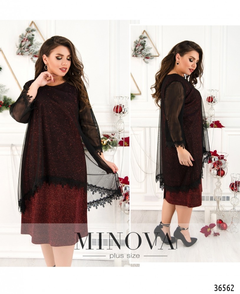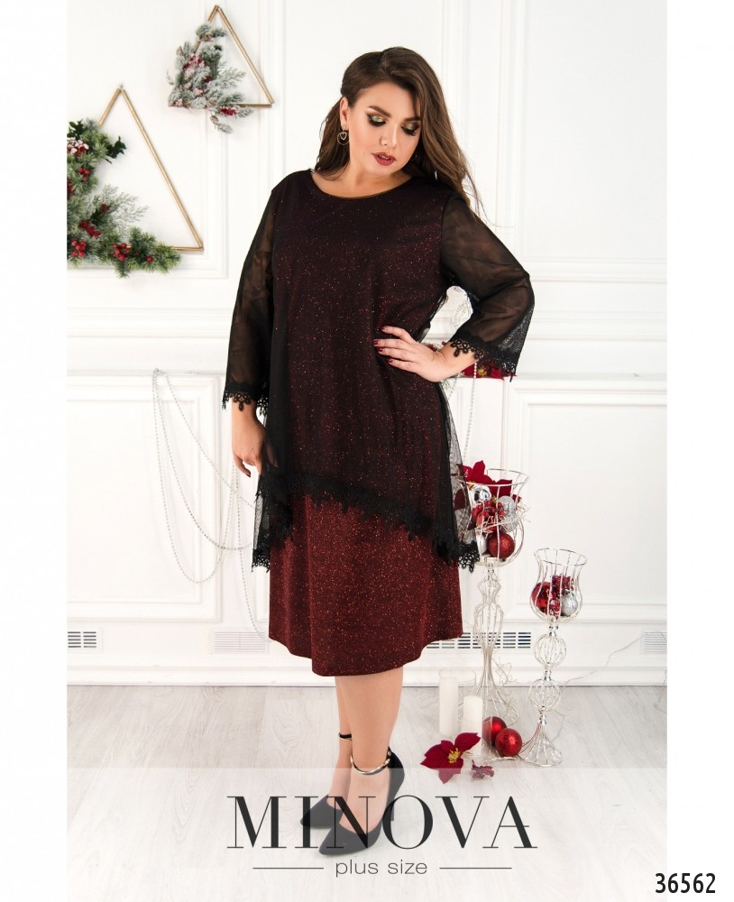 Двуслойные платья всегда выглядят так симпатично! Minova представляет в новом каталоге модель платья батал из блестящей красной ткани с нитями люрекса, изнутри ткань гладкая. Накидка – из полупрозрачной контрастной сеточки, ниспадающей мягкими складками. Сеточка снизу украшена ажурным кружевом. Рукава полной длины, полностью выполнены из сеточки и также декорированы кружевом. На груди на подкладке – небольшие вытачки. Карманы и застёжки отсутствуют. Платье длины миди, поэтому рекомендуем обувь на каблуке или танкетке.