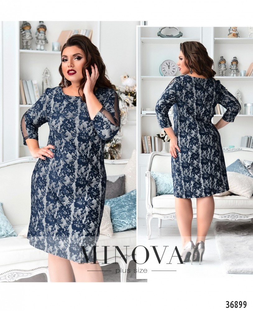 Женственное и романтичное приталенное платье батал из свежего пополнения каталога женской одежды больших размеров от Minova. Платье не длинное, очень стильное и аккуратное. Снизу – гладкая подкладка, сверху подшита сеточка с люрексом и кружевом. На груди – небольшие вытачки, рукава длиной ¾, без манжет, сверху подшита сеточка в виде лацканов от плеча до запястья. Карманы отсутствуют. Вырез горловины широкий, полукруглый, застёжка – вшитая по спинке змейка. Платье прекрасно дополнит ваш праздничный гардероб, особенно в сочетании с нарядной обувью.