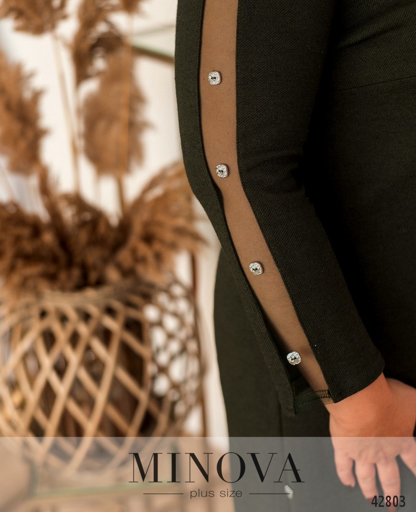 Оригинальное платье плюс сайз без застёжек и карманов. Рукава украшены сеточкой в виде лампасов. На груди вытачки. На подоле по бокам нашиты декоративные пуговицы. Вырез горловины полукруглый.